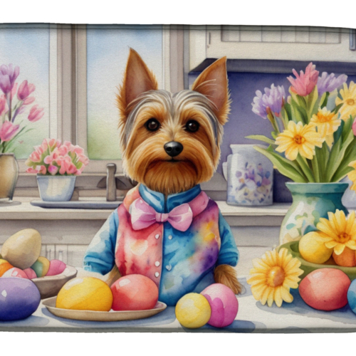 Dish Drying Mat featuring breed specific Silky Terrier artwork. Celebrate Easter with this Easter Dish Drying Mat. Say goodbye to messy countertops and soggy dish towels with our innovative dish drying mat. Our high-quality dish drying pad is designed to keep your countertops dry while offering a stylish and efficient solution. Whether you’re air drying dishes, glasses, stemware, silverware, pots, pans, bottles, or even fruits and vegetables, our dish mat is the perfect choice. The 14 inches x 22 inches size fits most counters and dish drying racks, and the non-slip design ensures stability. Made with water-absorbent polyester and a polyurethane foam insert, our dish drying mat is not only functional but also durable. It’s machine washable and printed in the USA for long-lasting use. The beautiful artwork adds flair to your kitchen decor, making it a perfect housewarming gift or present for any occasion. Upgrade your kitchen experience with our absorbent and versatile dish drying mat.