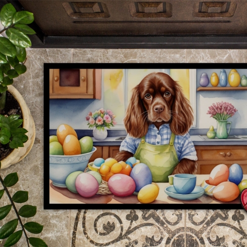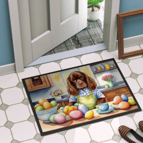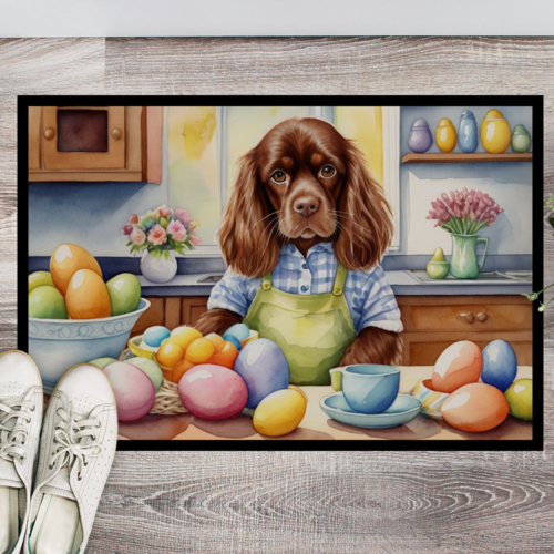 Doormat featuring breed specific Sussex Spaniel artwork. Celebrate Easter with this Easter Doormat. Welcome your guests in style with our Artwork Door Mat, designed to withstand almost any weather condition. This mat, measuring approximately 18 by 27 inches, is held together by durable black binding tape. Its top layer, composed of polyester felt, is dyed with the eye-catching image you see on the mat. A few layers below provide the mat with stability, while its rubber bottom is stamped to help prevent slipping and ensures safety. Our mat works wonderfully as both an indoor or outdoor door mat. For cleaning, simply hose it off with water or use a power washer – no need for any cleaner that produces suds. Avoid scrubbing with a brush, instead, opt for the vacuum on floor setting. Designed manufactured and printed in the USA, this mat is a perfect addition to your porch, outdoor kitchen, entryway, or any indoor space. Its unique design makes it a charming decorative rug that greets your guests and adds a stylish touch to your home decor.