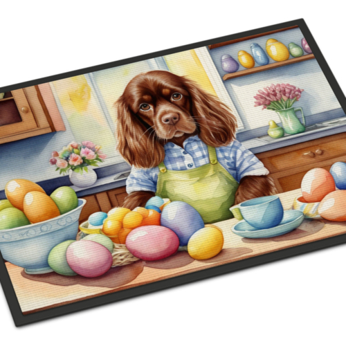 Doormat featuring breed specific Sussex Spaniel artwork. Celebrate Easter with this Easter Doormat. Welcome your guests in style with our Artwork Door Mat, designed to withstand almost any weather condition. This mat, measuring approximately 18 by 27 inches, is held together by durable black binding tape. Its top layer, composed of polyester felt, is dyed with the eye-catching image you see on the mat. A few layers below provide the mat with stability, while its rubber bottom is stamped to help prevent slipping and ensures safety. Our mat works wonderfully as both an indoor or outdoor door mat. For cleaning, simply hose it off with water or use a power washer – no need for any cleaner that produces suds. Avoid scrubbing with a brush, instead, opt for the vacuum on floor setting. Designed manufactured and printed in the USA, this mat is a perfect addition to your porch, outdoor kitchen, entryway, or any indoor space. Its unique design makes it a charming decorative rug that greets your guests and adds a stylish touch to your home decor.