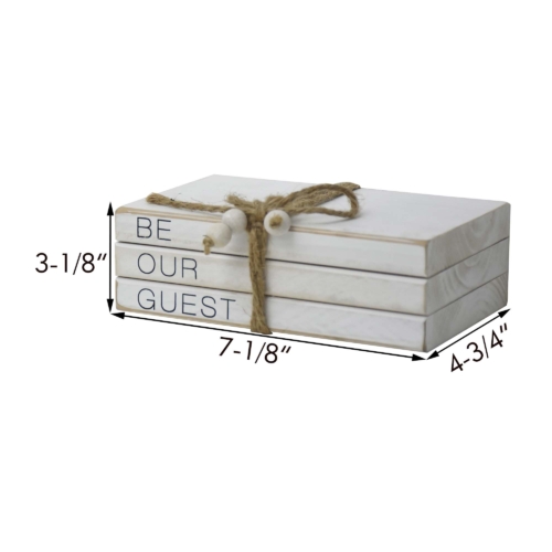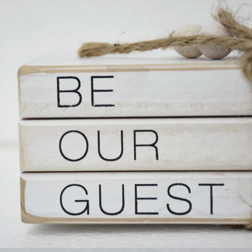 “Modern Farmhouse Home Decor-The wooden fake books are painted white and distressed a bit for a worn look. The spine of the books reads “Be our guest”.