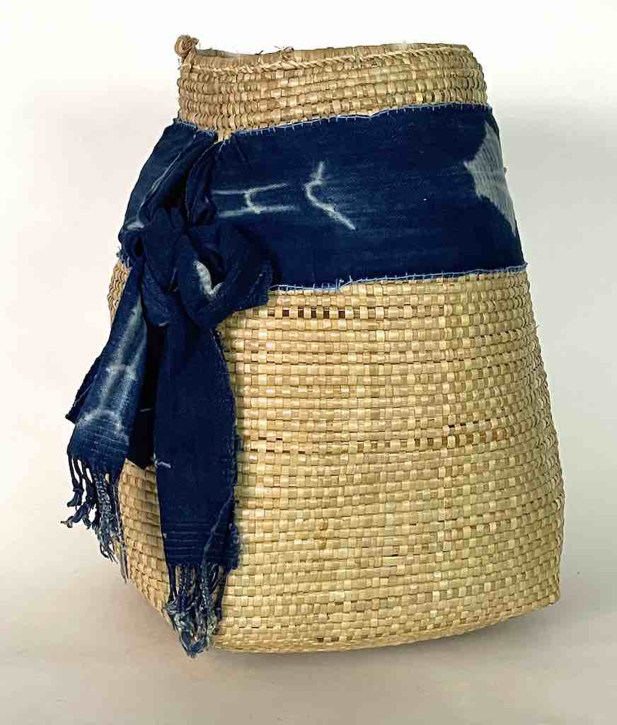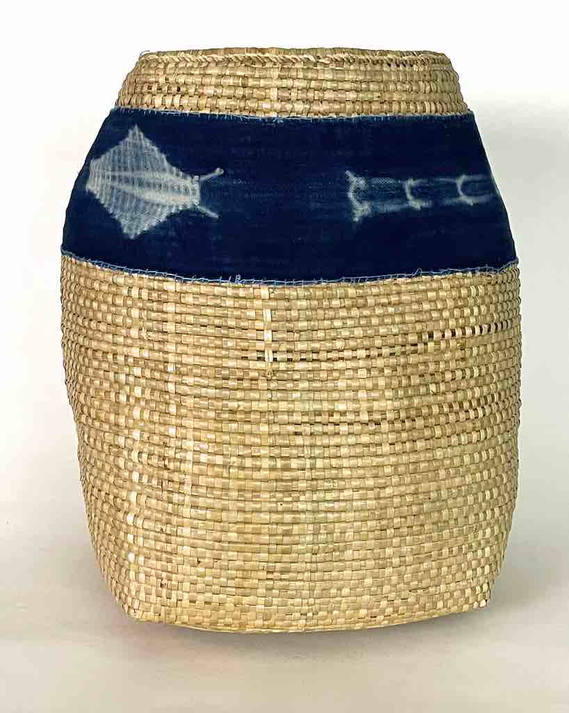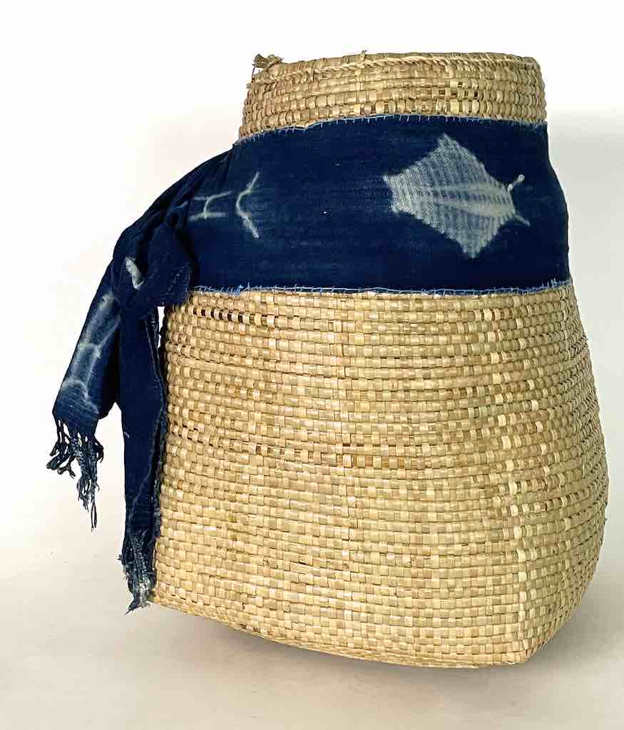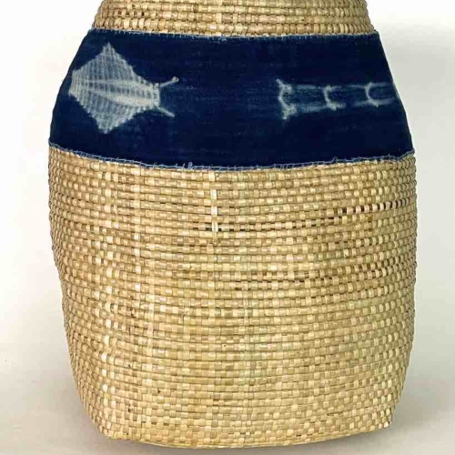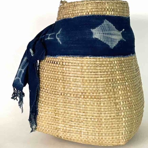 This deep flexible deep basket, handwoven by the women of the Mina tribe in coastal Benin, are made of a very plentiful lowland grass from the swampy delta area of Benin. We have added an indigo cloth to accent the beauty of this already exceptional basket. We got the indigo cloth from the Mossi women of Burkina Faso. We sell the full pieces of this cloth separately. This type of basket is as useful for us as they are for the people of Benin although we would be more likely to put a plant in them and they would use it to transport and store food items. 16 1/2″ deep x 8″ diameter opening at the top x 13″ widest diameter (42 x 20 x 33 cm)