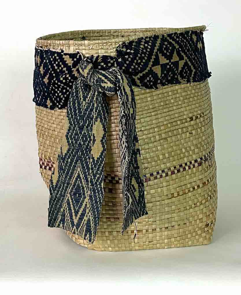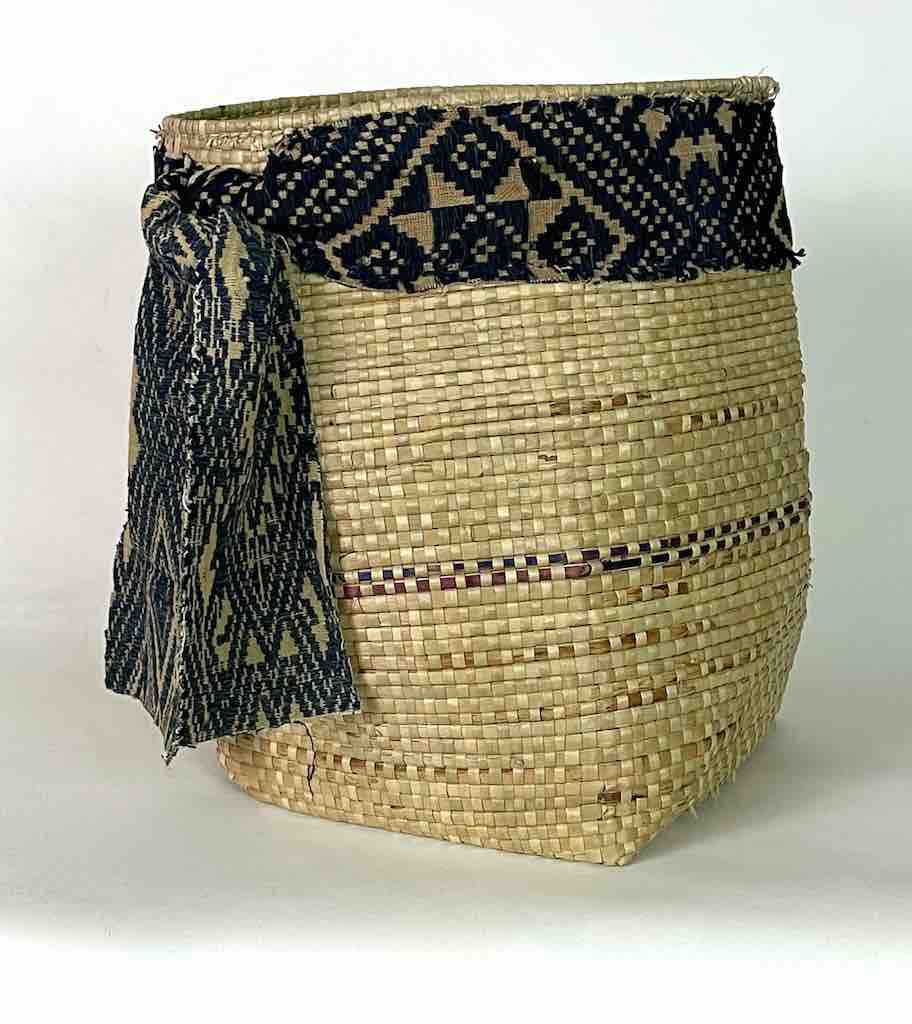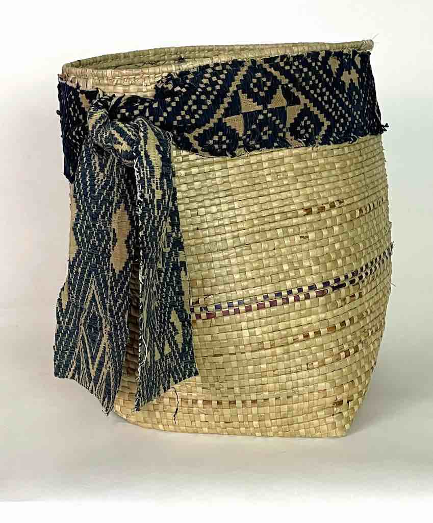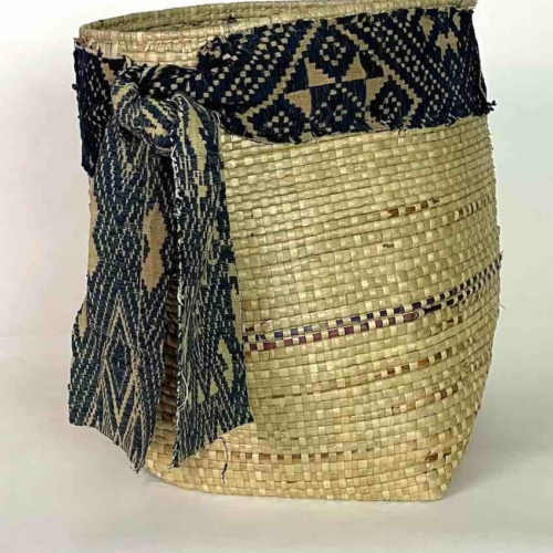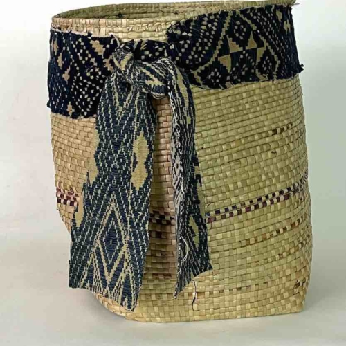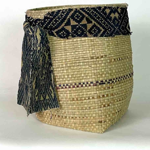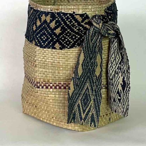This flexible deep basket, handwoven by the women of the Mina tribe in coastal Benin, was made of the very plentiful lowland grass from the swampy delta area of Benin. We have added a strip of handwoven intricately designed vintage cloth to accent the beauty of this already exceptional basket. This cloth was made by the highly skilled weavers of the Black Thai people of Viet Nam. We sell full pieces of this cloth separately. This type of basket is as useful for us as they are for the people of Benin although we would be more likely to put a plant in it and they would use it to transport and store food items. 14 1/2″ deep x 11″ diameter at the top