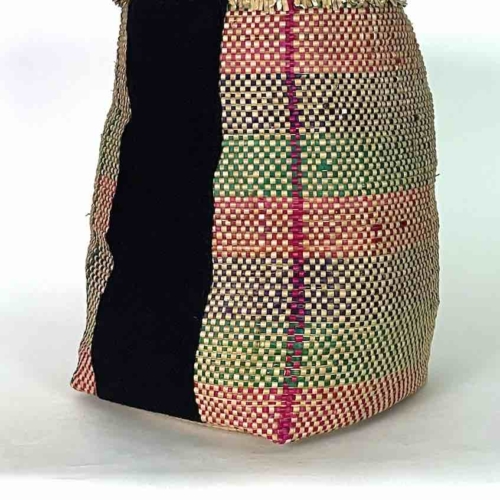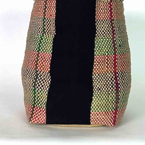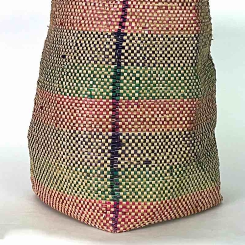 This flexible deep basket, handwoven by the women of the Mina tribe in coastal Benin, was made of the very plentiful lowland grass from the swampy delta area of Benin. We have added a strip of handwoven indigo Tiv cloth from Nigeria to accent the beauty of this already exceptional basket. This unique, traditional cloth was made by skilled weavers in Benue State. We sell full pieces of this cloth separately. This type of basket is as useful for us as they are for the people of Benin although we would be more likely to put a large plant in it and they would use it to transport and store food items. 16″ deep x 11″ opening diameter at the top