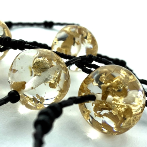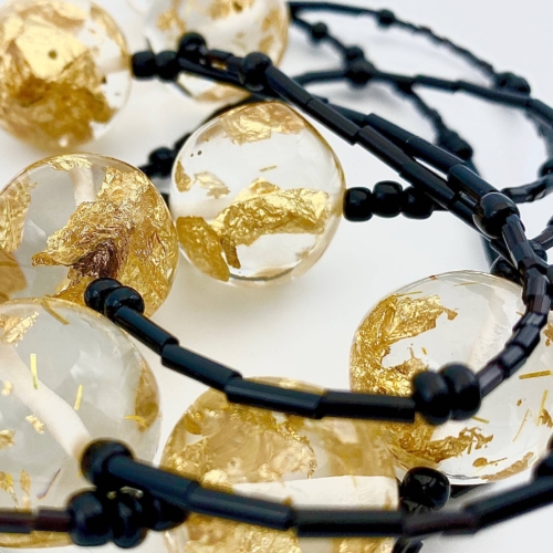 Introducing a delicate and sophisticated resin necklace from Atelier 1701. This elegant piece features golden spheres, each meticulously handcrafted to capture a luxurious essence. The translucent resin with embedded golden flakes offers a unique and refined look. As each resin sphere is hand-poured, no two pieces are identical, making this necklace a truly unique accessory. The image shown is a reference, showcasing the one-of-a-kind nature of every necklace. Enhance your ensemble with this exquisite, artisanal creation that radiates charm and individuality.