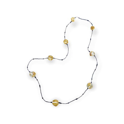 Introducing a delicate and sophisticated resin necklace from Atelier 1701. This elegant piece features golden spheres, each meticulously handcrafted to capture a luxurious essence. The translucent resin with embedded golden flakes offers a unique and refined look. As each resin sphere is hand-poured, no two pieces are identical, making this necklace a truly unique accessory. The image shown is a reference, showcasing the one-of-a-kind nature of every necklace. Enhance your ensemble with this exquisite, artisanal creation that radiates charm and individuality.