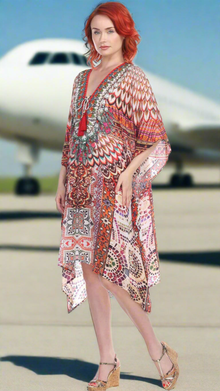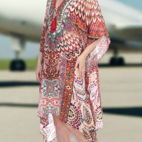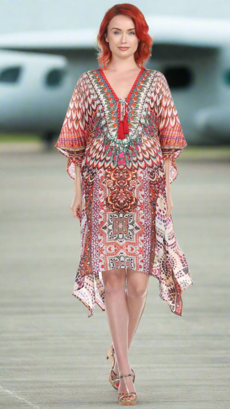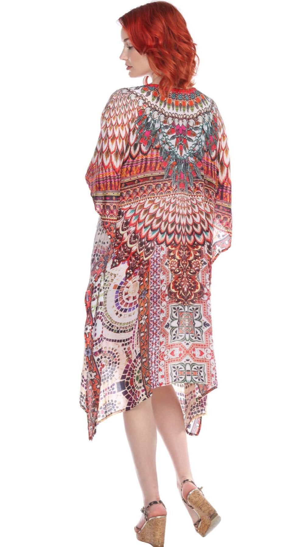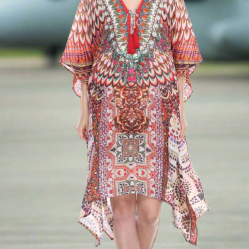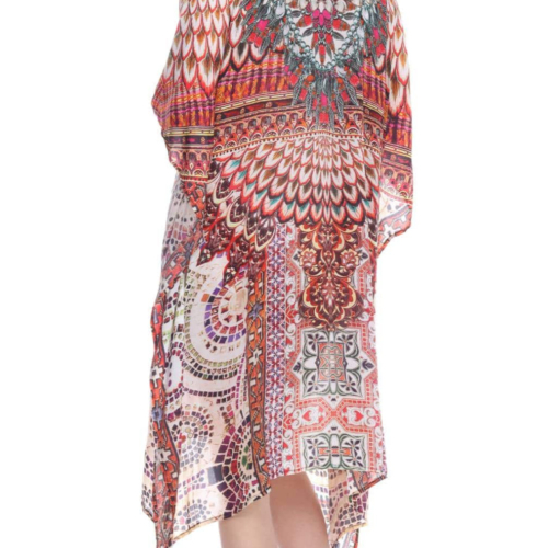 Kaftans work perfectly as beachwear Cover-Ups, carelessly-yet-carefully strewn over swimwear. Get knotty (read: naughty!) as the string of the bikini top peeps through the sensuous embroidered V-neck of the short kaftan. Check out the collection at La Moda. Sheer Cover Up Kaftan Style Beachwear, Resort Wear, Cruise 100% Viscose Silk V-Neckline, Mid-Thigh Animal Print / Multi-Color Size: One Size Washing Instruction: Dry Clean Material:100% Viscose SilkPack Details:4 pcs