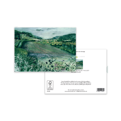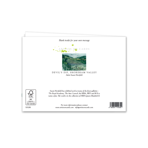 A striking landscape greeting card depicting Devil’s Dip, the scenic valley at Shoreham in Kent. Rich countryside tones and painterly textures bring this rural view to life, offering customers a unique choice for birthdays, thank you notes, or simply keeping in touch. A popular addition to collections for galleries, gift shops, and independent retailers.