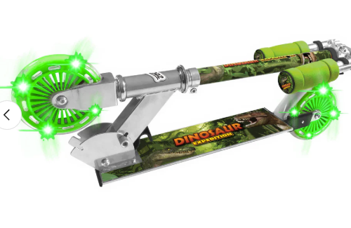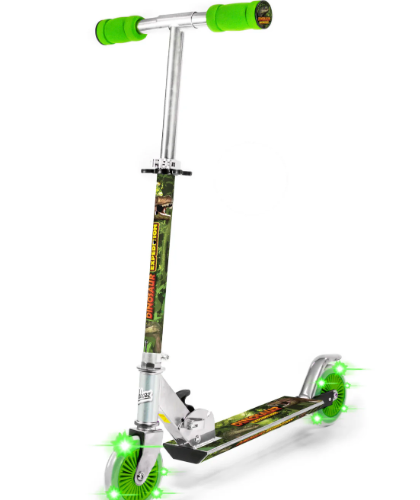 Two-wheeled scooter with a light up wheels and a dinosaur design. Start moving on the scooter and the lights in the wheels automatically trigger, illuminating the front and back of the scooter. There is also a foot brake located on the back wheel, for extra control. And finally, the scooter folds flat for easy storage and transportation.