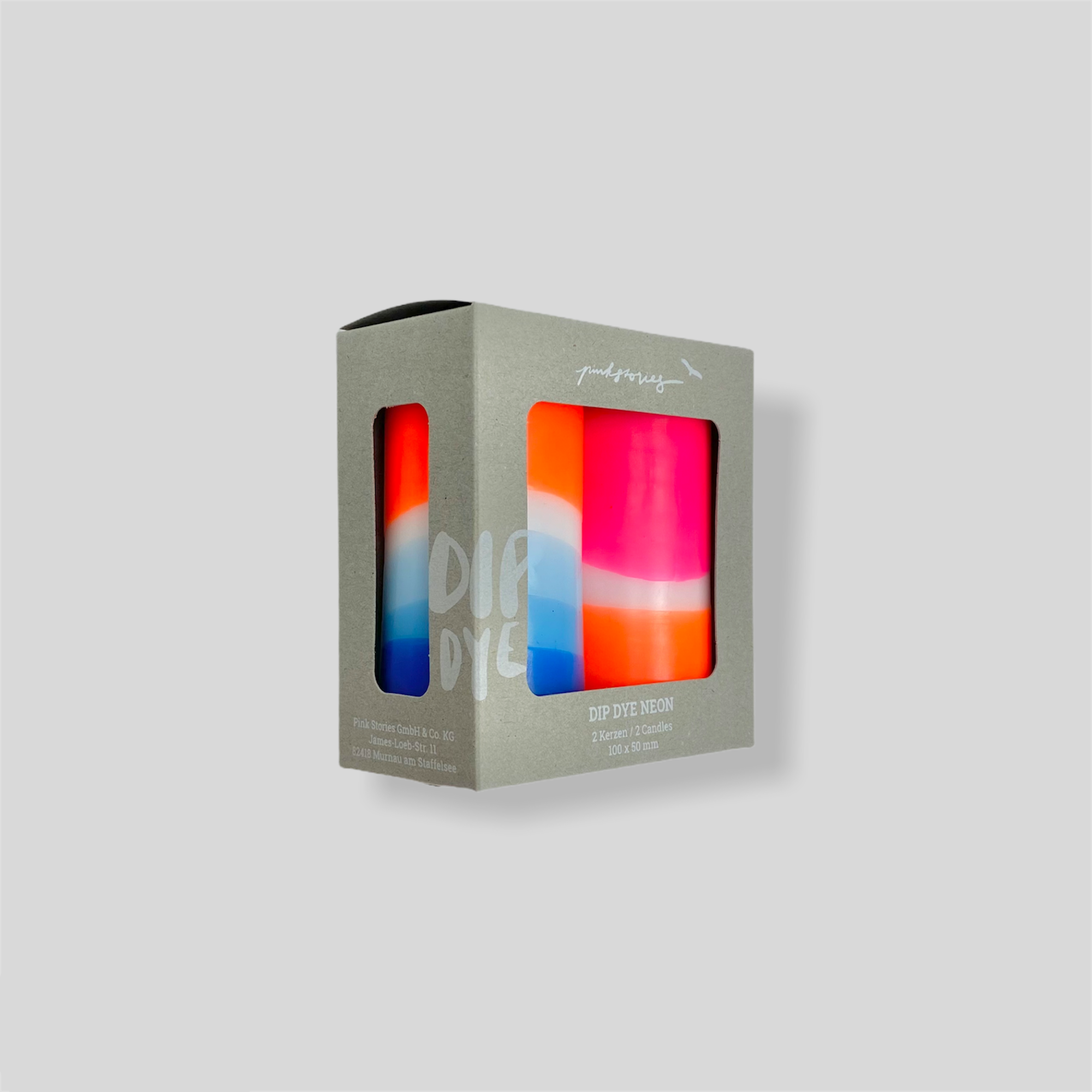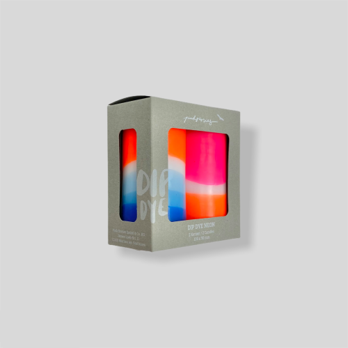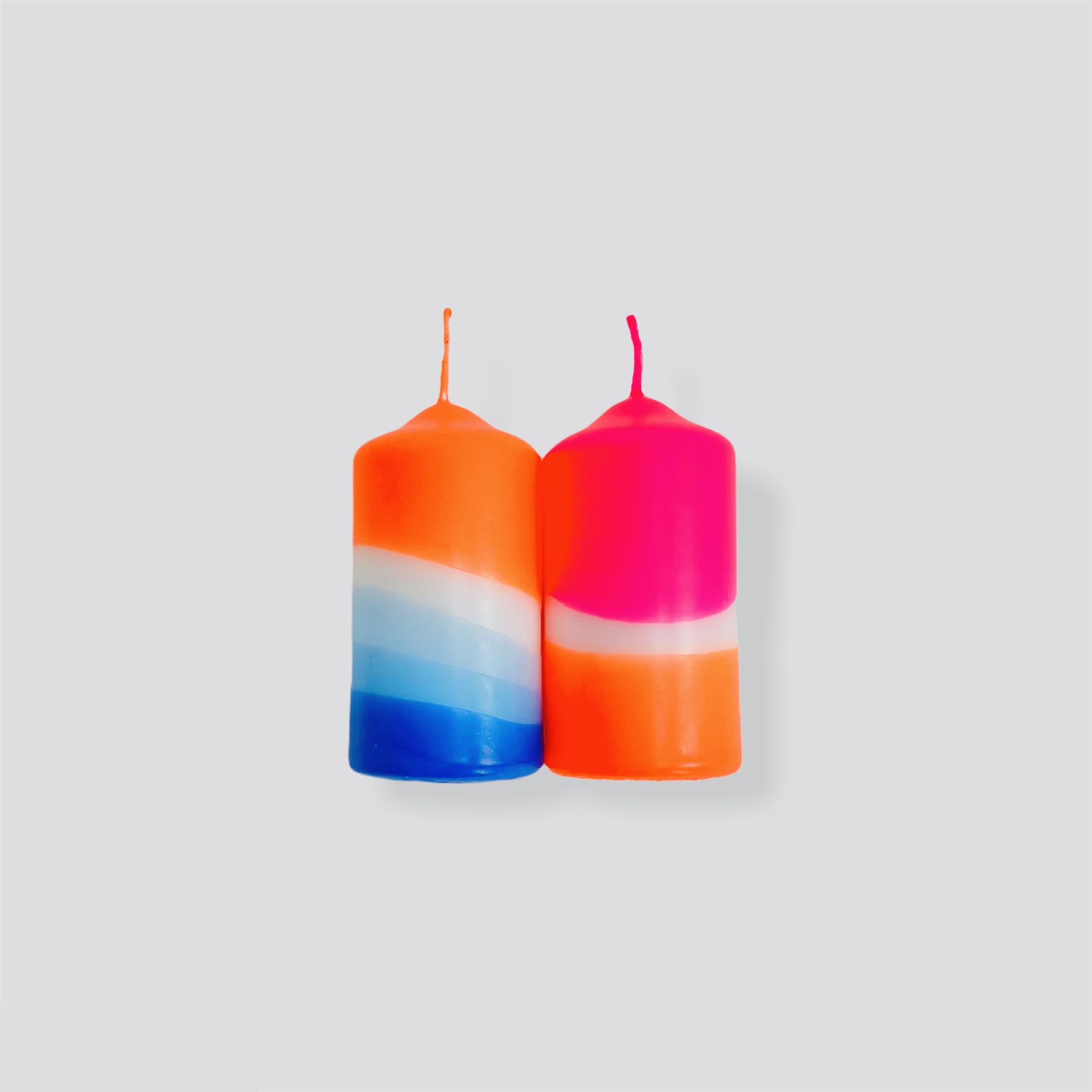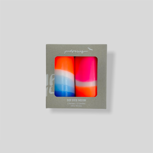 Set of two lovingly hand-dyed pillar candles in neon look. The colours remain the same, the patterns vary with each candle and make them unique.