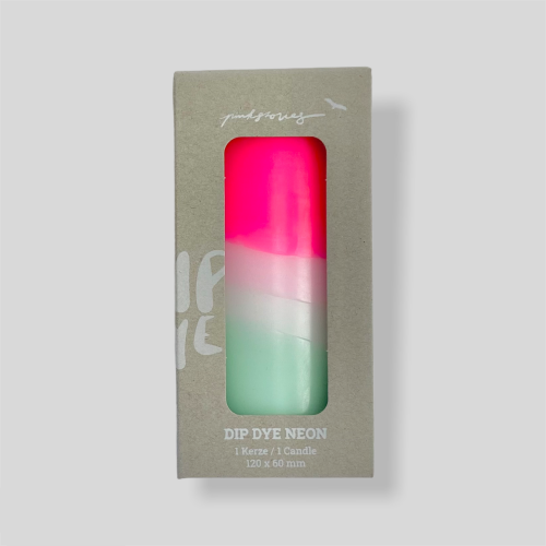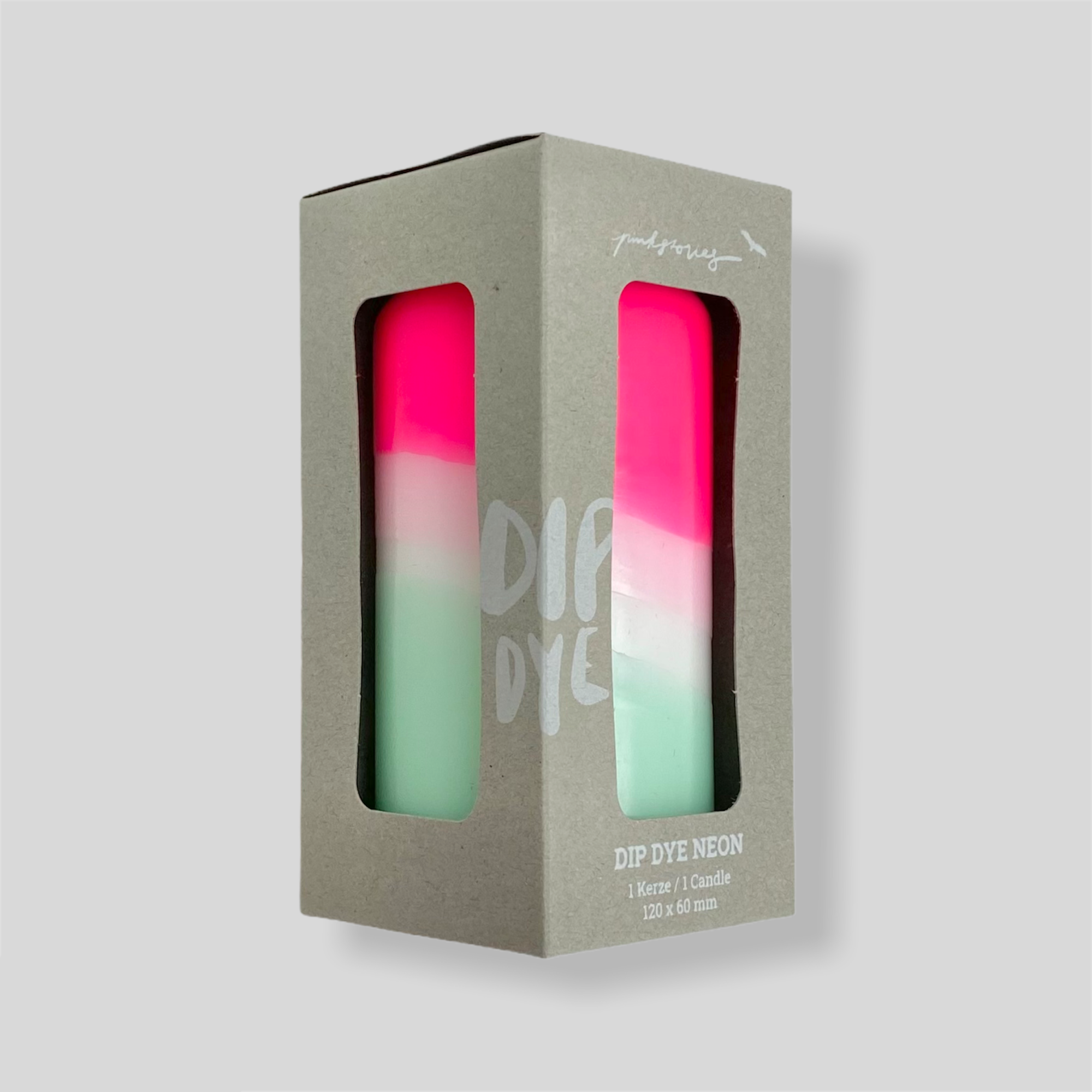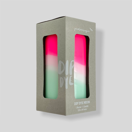 One lovingly hand-dyed candle in neon look. The colors remain the same, the pattern vary with each candle and make them unique.