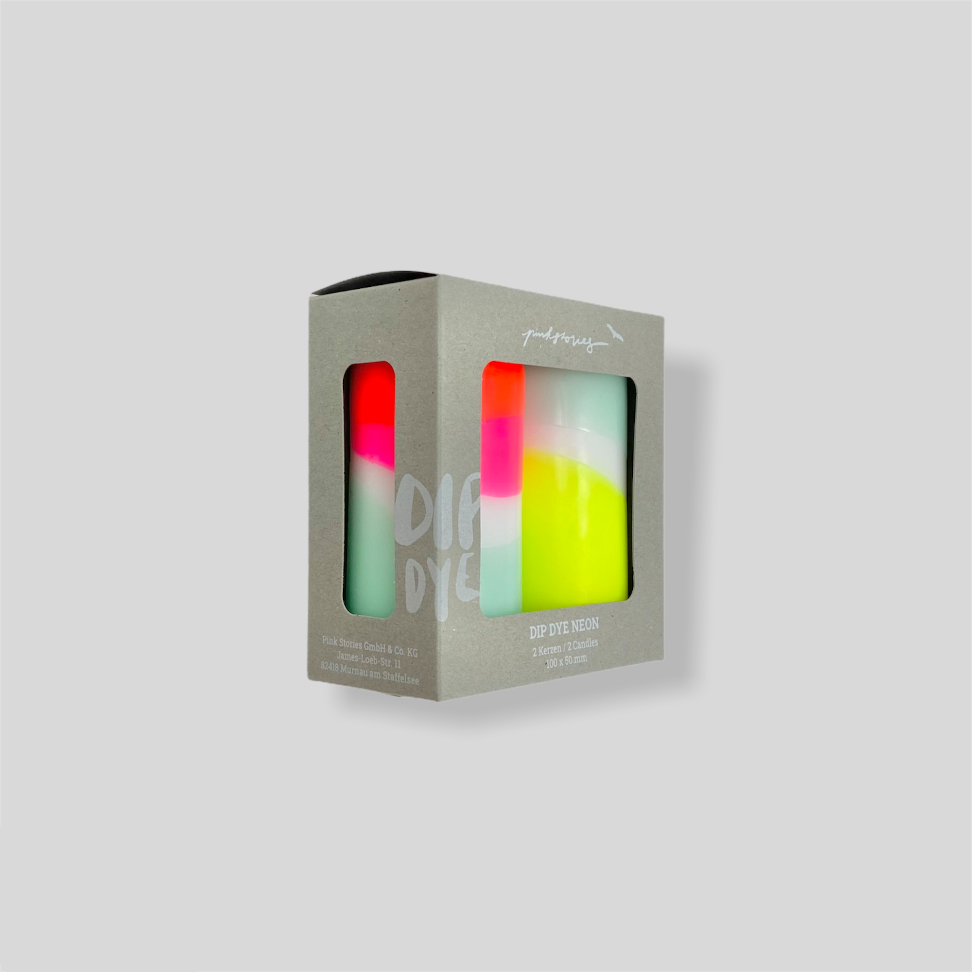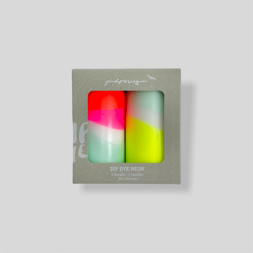 Set of two lovingly hand-dyed pillar candles in neon look. The colours remain the same, the patterns vary with each candle and make them unique.