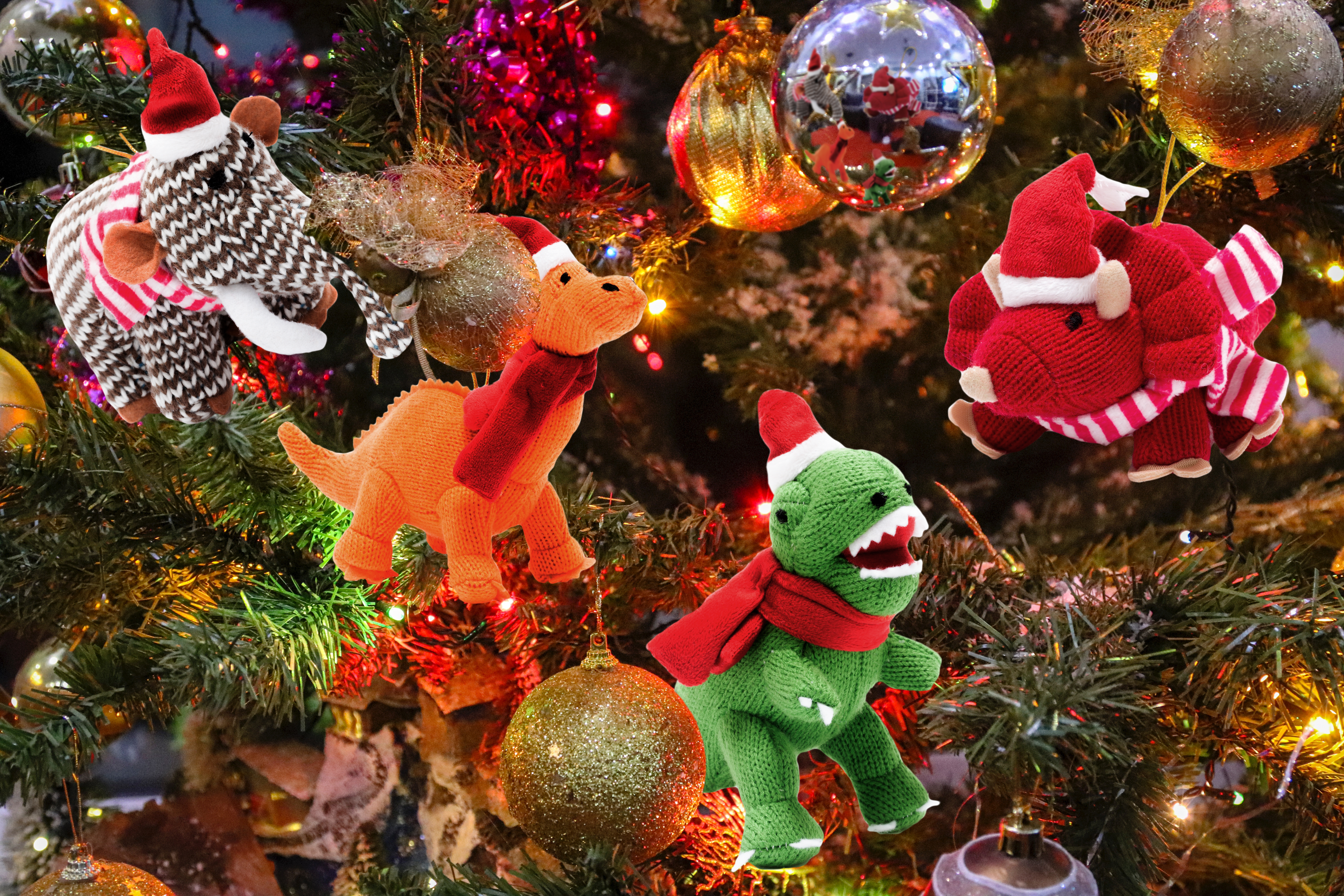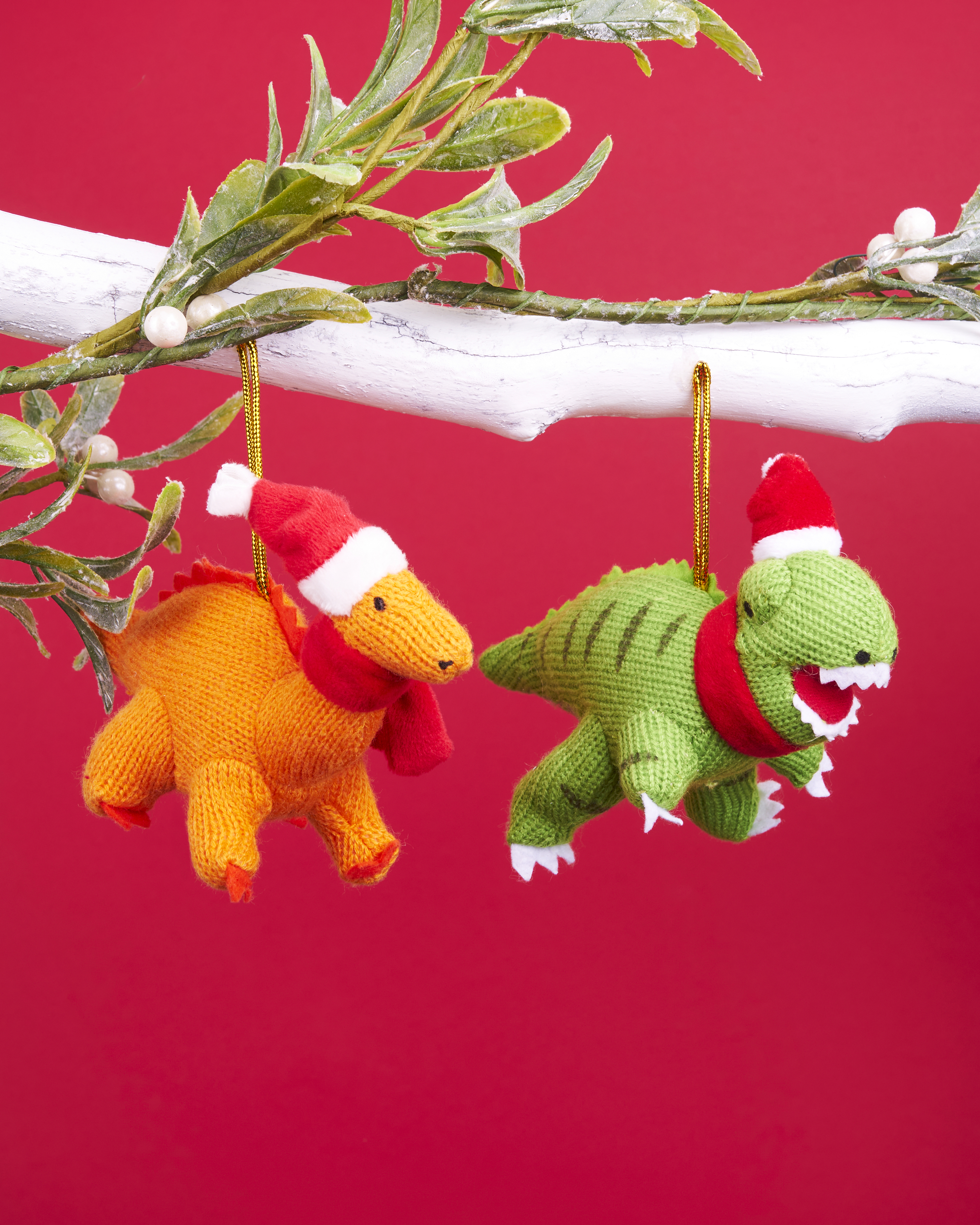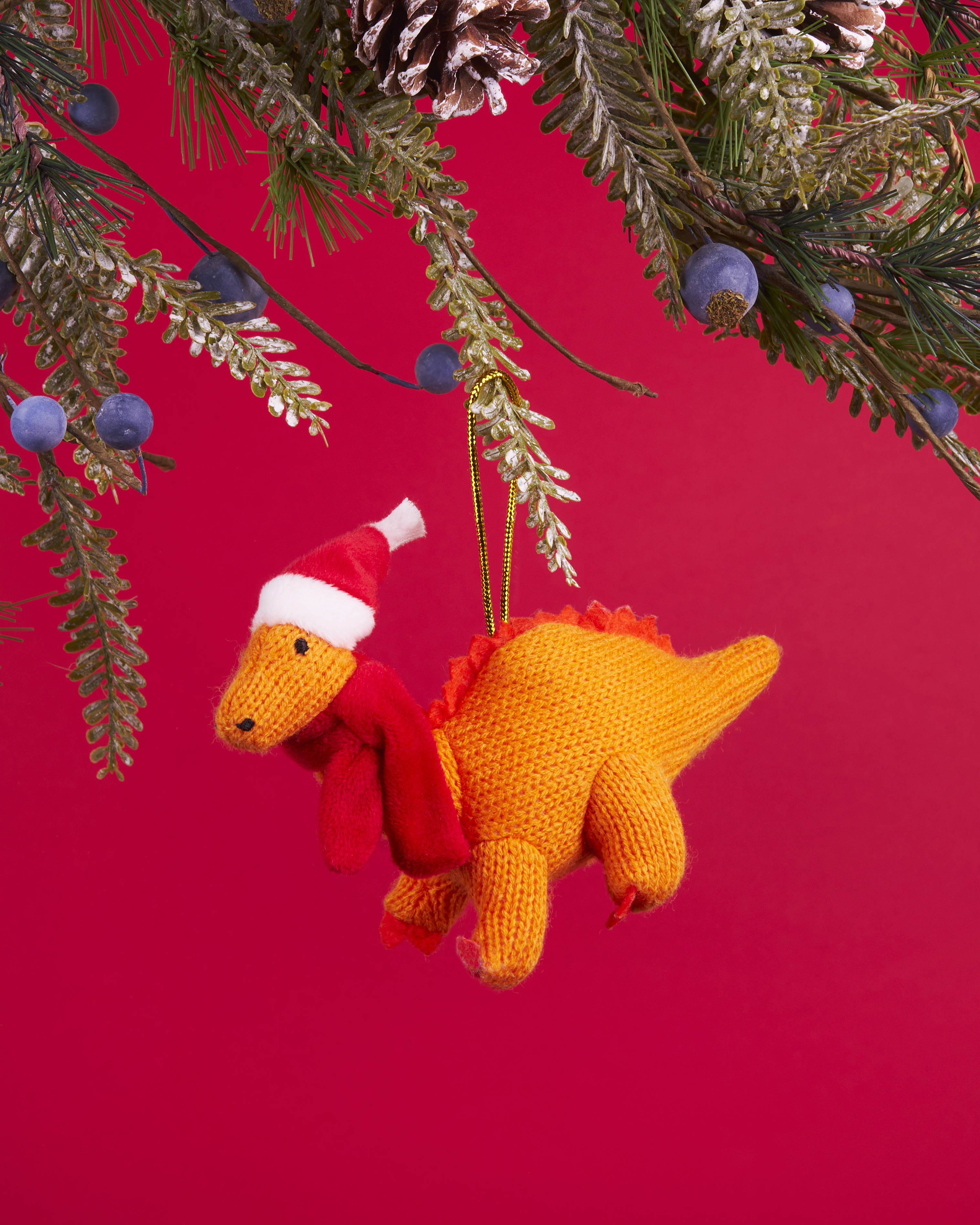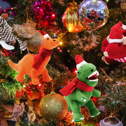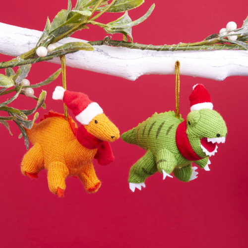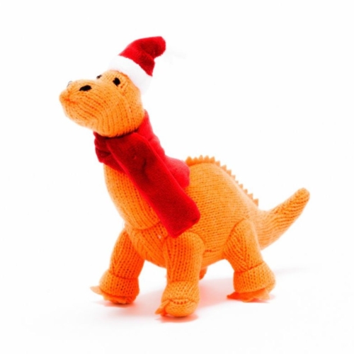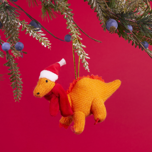 Part of a range of exclusive knitted Christmas tree decoration our knitted orange Diplodocus dinosaur soft toy now available as a Christmas decoration.