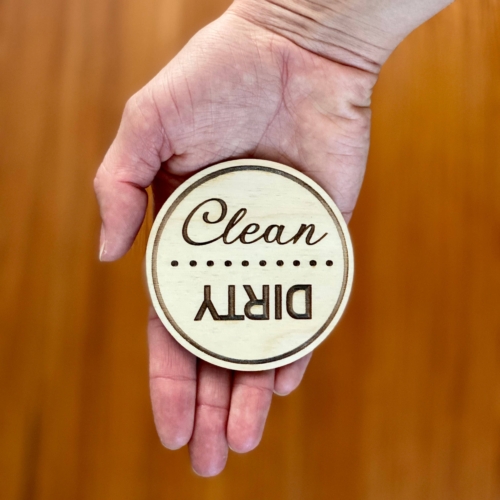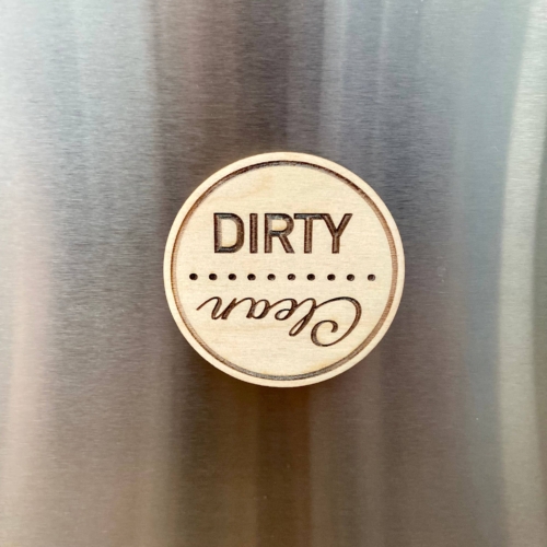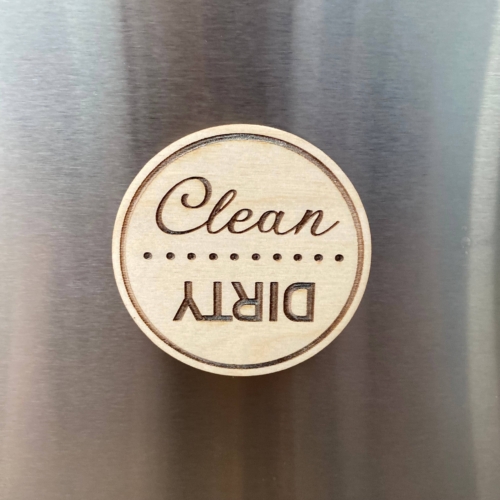 This engraved wood disc magnet offers a handy way of keeping track of your dishwasher’s status. Simply place it on the front of your dishwasher’s metal face and then rotate it whenever you start a cleaning cycle or load it with dirty dishes.The wood disc is 3″ (76mm) in diameter, 1/8″ (4mm) thick, and laser engraved. It comes with a strong magnet mounted on the back.Details:• 3″ in diameter, 1/8″ thick• Made from Baltic Birch plywood• Laser engraved with a high level of precision