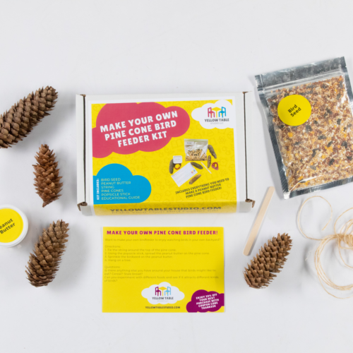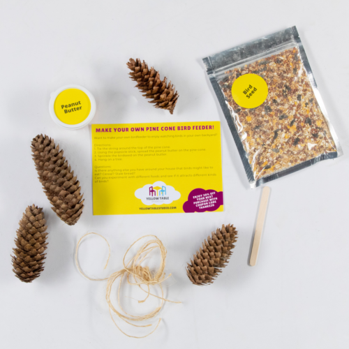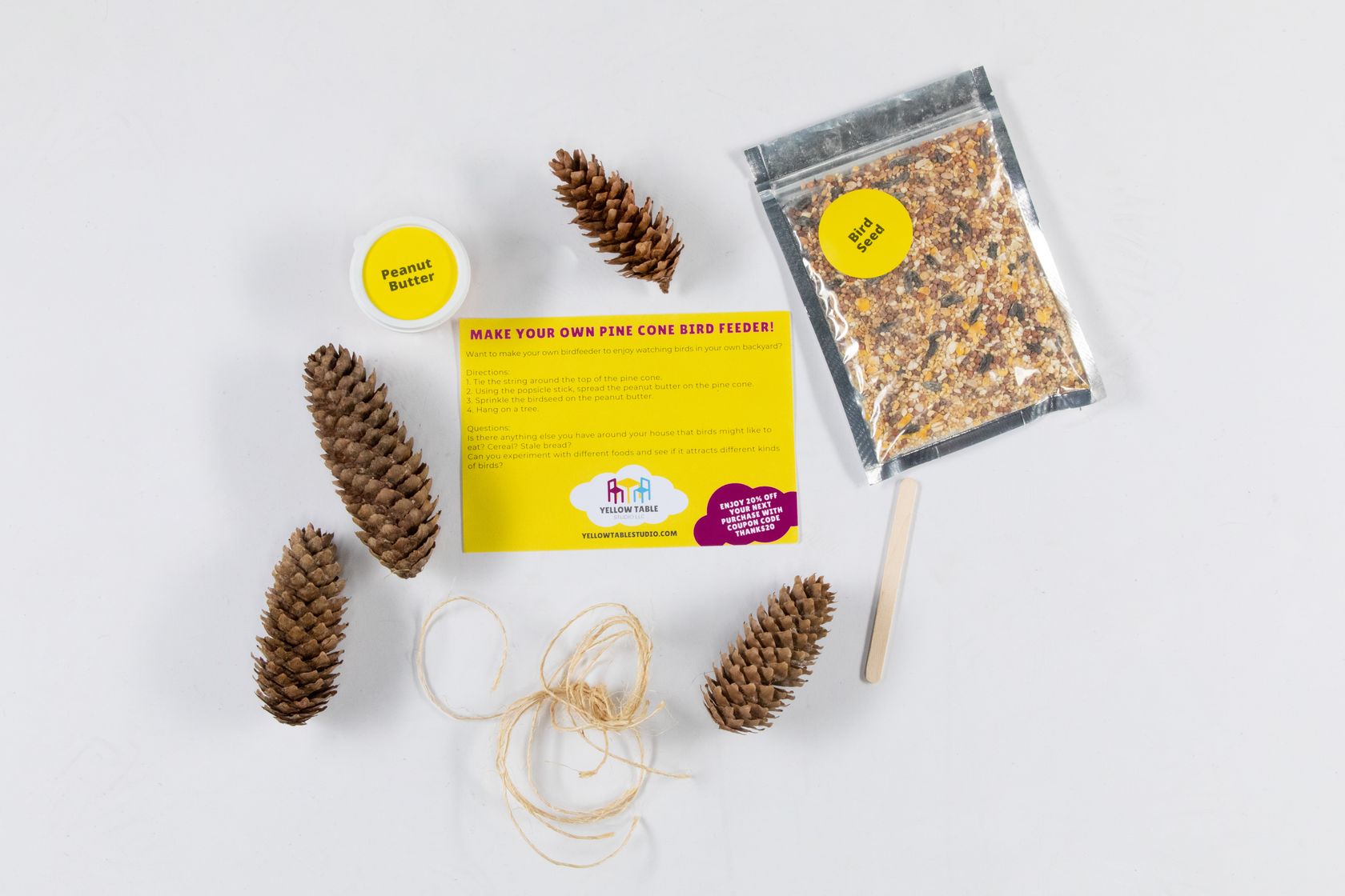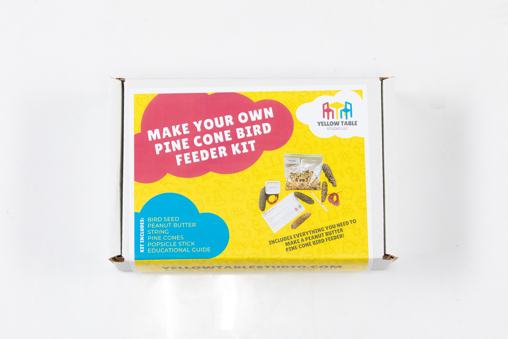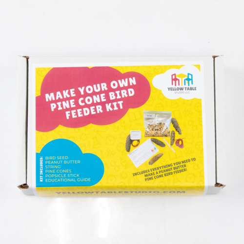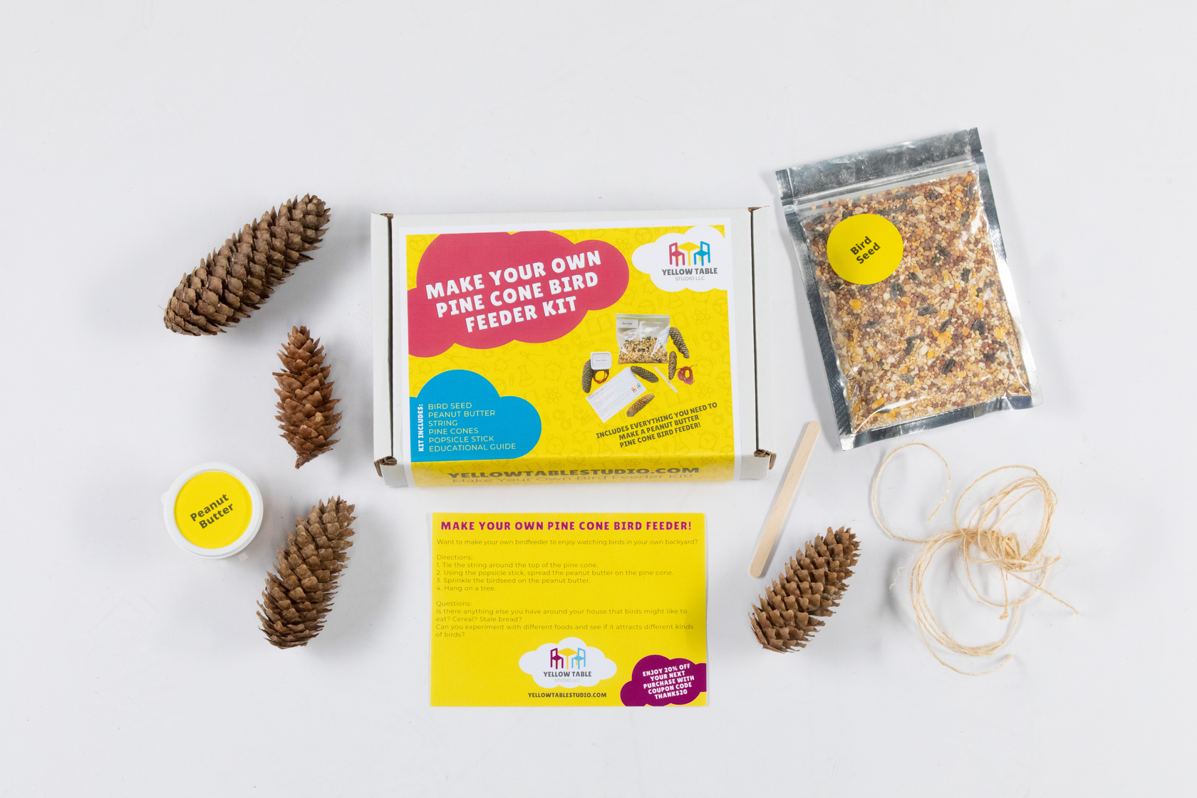 Encourage a love of nature and bird watching with this DIY bird feeder kit! This kit is fun for all ages. Use peanut butter to “glue” bird seed onto pine cones, making an all natural bird feeder.
