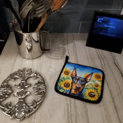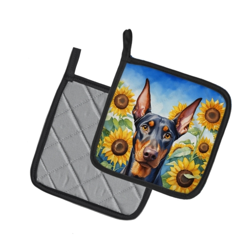 Pair of Pot Holders featuring breed specific Doberman Pinscher artwork. A Pair of Pot Holders to match your kitchen decor. Made in the USA these are thick and functional. Full color artwork decorates the front polyester fabric of the hot pad and accented by a black trim. Use these at as a trivet for your Thanksgiving or Christmas tablescape. Filled with insulated fabric and quilted for durability. These colorful pot holders will make a great gift for your favorite home cook or executive chef. Each pot holder measures approximately 7 1/2 inches by 7 1/2 inches. A hanging tab is included.