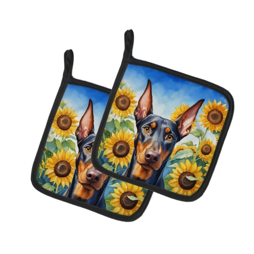 Pair of Pot Holders featuring breed specific Doberman Pinscher artwork. A Pair of Pot Holders to match your kitchen decor. Made in the USA these are thick and functional. Full color artwork decorates the front polyester fabric of the hot pad and accented by a black trim. Use these at as a trivet for your Thanksgiving or Christmas tablescape. Filled with insulated fabric and quilted for durability. These colorful pot holders will make a great gift for your favorite home cook or executive chef. Each pot holder measures approximately 7 1/2 inches by 7 1/2 inches. A hanging tab is included.