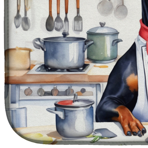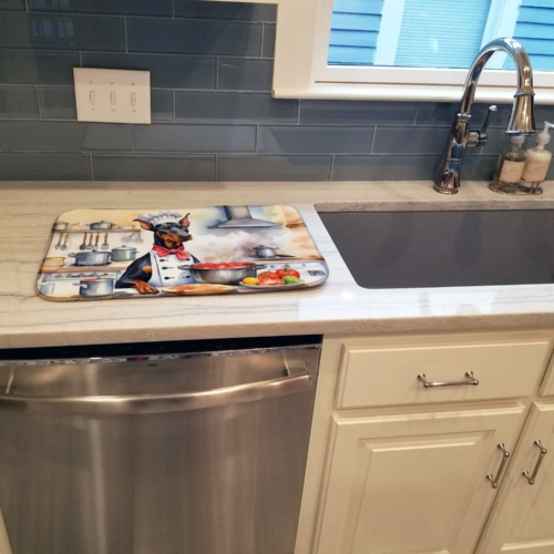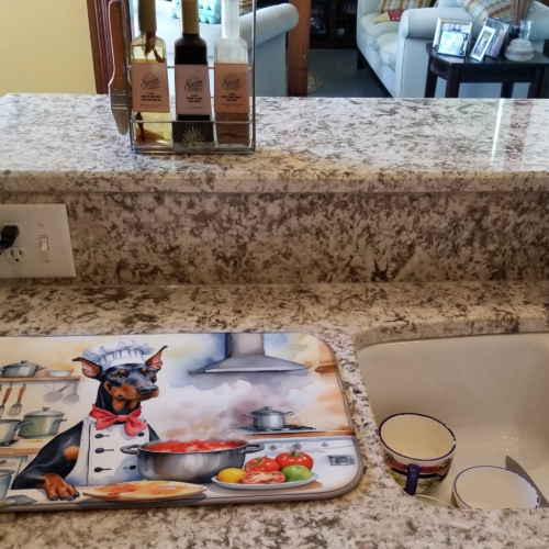 Dish Drying Mat featuring breed specific Doberman Pinscher artwork. Say goodbye to messy countertops and soggy dish towels with our innovative dish drying mat. Our high-quality dish drying pad is designed to keep your countertops dry while offering a stylish and efficient solution. Whether you’re air drying dishes, glasses, stemware, silverware, pots, pans, bottles, or even fruits and vegetables, our dish mat is the perfect choice. The 14 inches x 22 inches size fits most counters and dish drying racks, and the non-slip design ensures stability. Made with water-absorbent polyester and a polyurethane foam insert, our dish drying mat is not only functional but also durable. It’s machine washable and printed in the USA for long-lasting use. The beautiful artwork adds flair to your kitchen decor, making it a perfect housewarming gift or present for any occasion. Upgrade your kitchen experience with our absorbent and versatile dish drying mat.