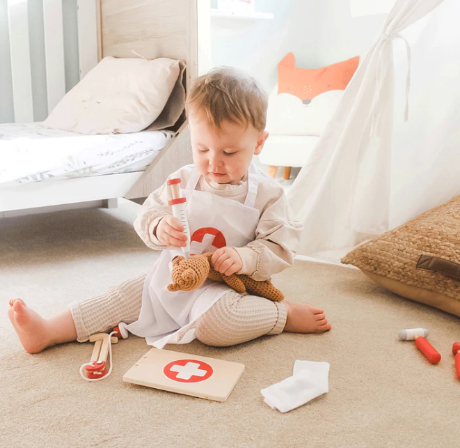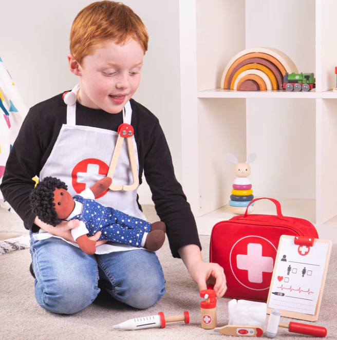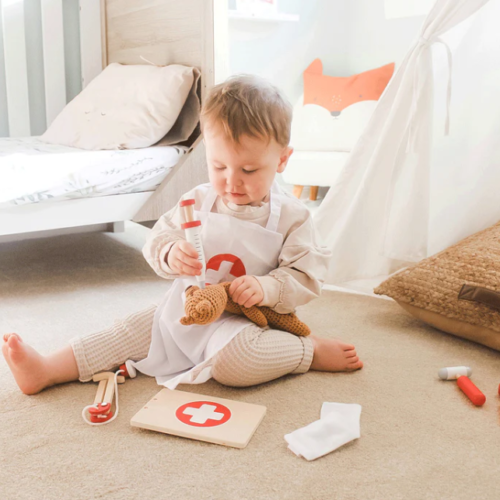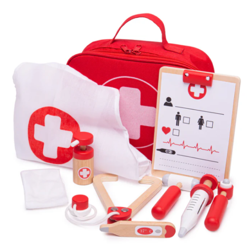 This wooden Doctor’s Kit is beautifully crafted to provide all the necessary tools for a child to care for their sick teddies and dolls. With a stethoscope to listen to the patient’s heart, a thermometer to check their temperature, and an otoscope to examine their ears, this 10-piece set promotes imaginative and educational play. The colorful carry case with handle makes it a perfect travel companion. Made with responsibly sourced materials and meets current European safety standards.