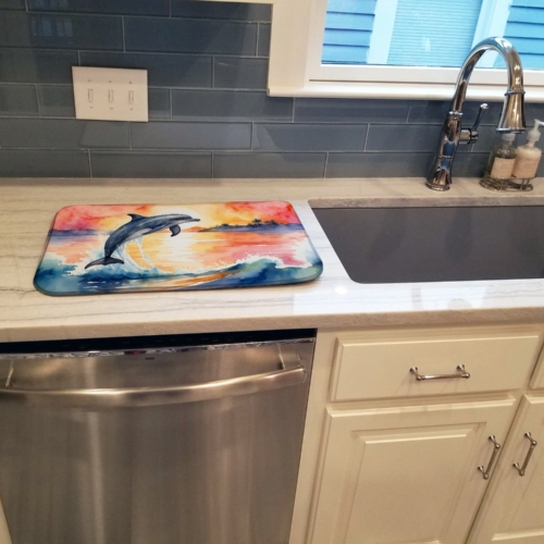 Dish Drying Mat featuring breed specific Dolphin artwork. Say goodbye to messy countertops and soggy dish towels with our innovative dish drying mat. Our high-quality dish drying pad is designed to keep your countertops dry while offering a stylish and efficient solution. Whether you’re air drying dishes, glasses, stemware, silverware, pots, pans, bottles, or even fruits and vegetables, our dish mat is the perfect choice. The 14 inches x 22 inches size fits most counters and dish drying racks, and the non-slip design ensures stability. Made with water-absorbent polyester and a polyurethane foam insert, our dish drying mat is not only functional but also durable. It’s machine washable and printed in the USA for long-lasting use. The beautiful artwork adds flair to your kitchen decor, making it a perfect housewarming gift or present for any occasion. Upgrade your kitchen experience with our absorbent and versatile dish drying mat.