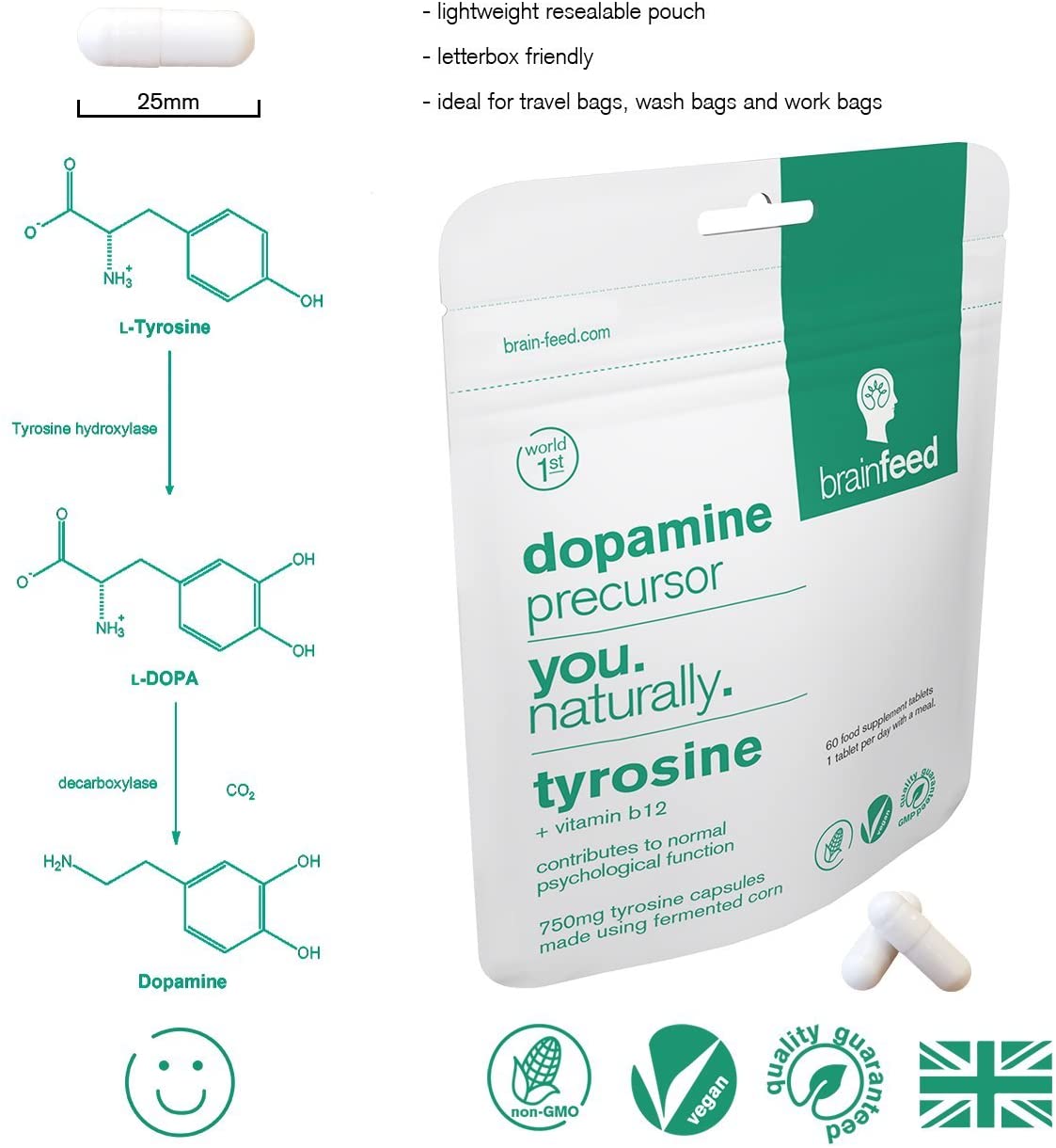 • the world 1st’s 800mg tyrosine capsules from fermented corn and the only natural nootropic for dopamine