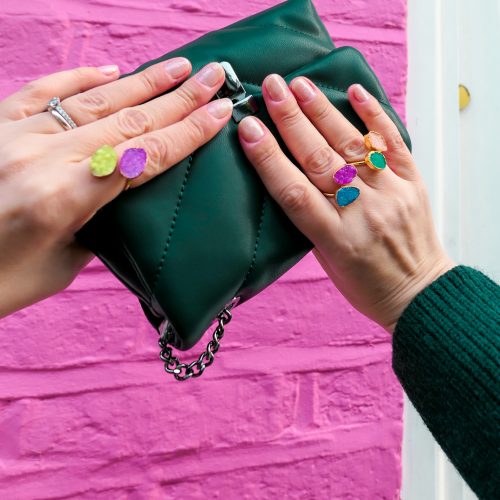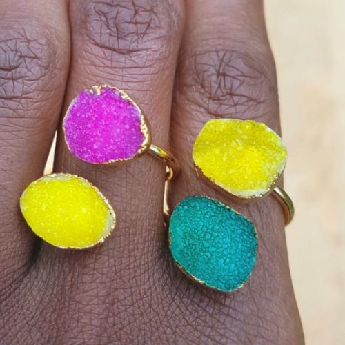 Colourful druzy stone gold adjustable rings set in 18K gold-plated metal . The colour intensities and shapes vary from ring to ring making each item unique! A beautifully created ring at an affordable price bang on trend with this season’s colour craze.