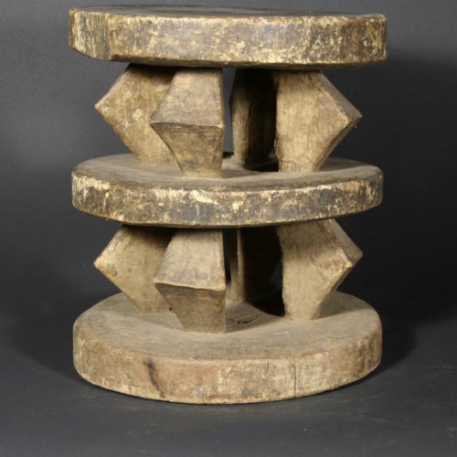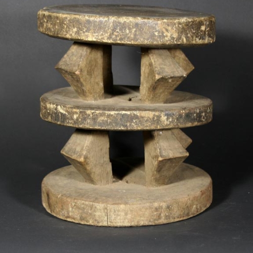 This is a great modification on the more common round stool design. It is 11 3/4″ tall, 10 3/4″ diameter (30 x 27 cm). What a great design innovation within the traditional village-level African context.