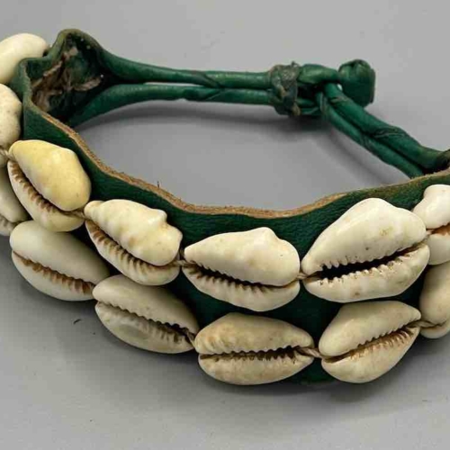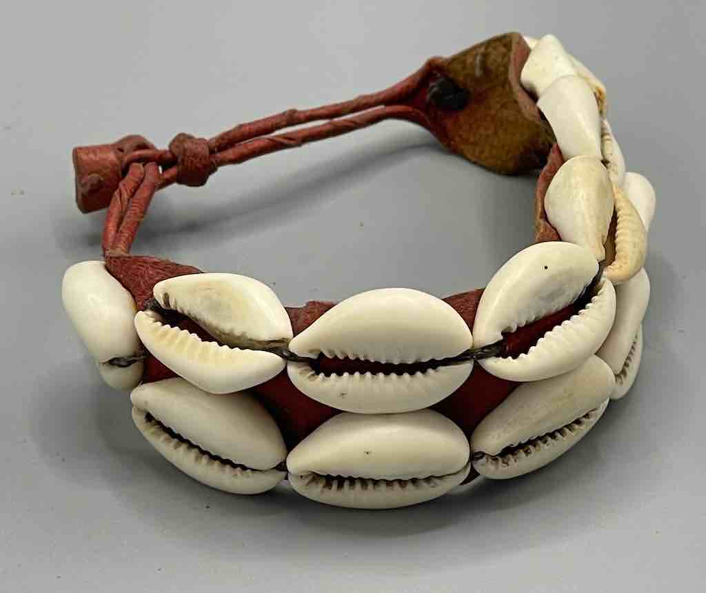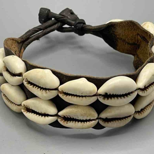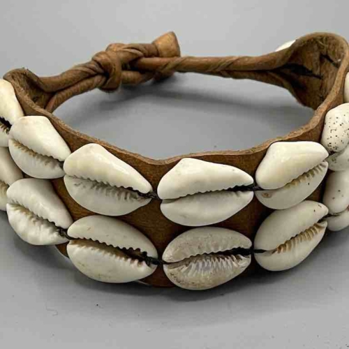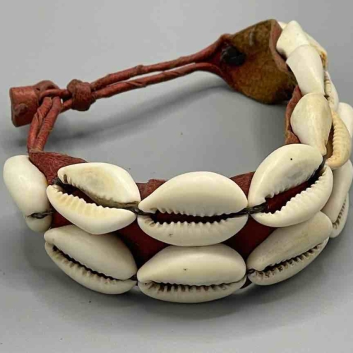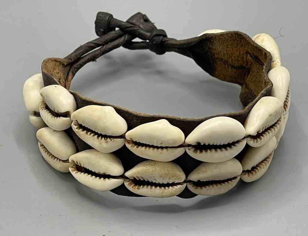 These traditional bracelets were worn by both men and women for protective purposes, as well as personal adornment. The leather, made from goatskin, would have contained items of medicinal or spiritual value which defend the wearer from whatever he or she may consider to be threatening to them. Cowrie shells, prior to European occupation, were currency and so still reflect their former significance. The clasp for each is the traditional ball and loop style. These cowrie shells are the real thing, vintage shells that for centuries were popular currency in West Africa. There are 5 different leather colors available: Black, Red, Natural, Purple, Green. The sizes do vary but most are approximately 2 1/4″ (5.7 cm) in internal diameter x 7/8″ of leather width (2.2 cm). The cowrie shells’ width increases that width to 1″ (2.5 cm)