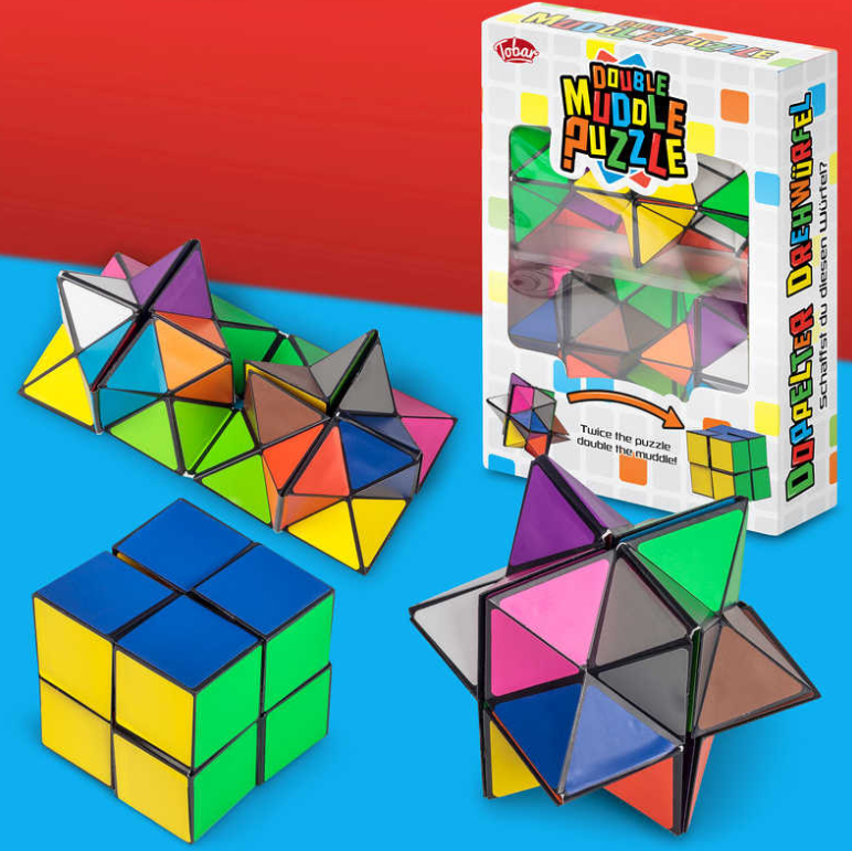 Set of two geometric shapes that flip and fold together to make a cube. This item is unlike any other shape puzzle we’ve ever seen, with the two pieces able to twist and flip in a range of unique ways. The two parts combine to form a two by two cube with coloured faces that resemble a classic puzzle cube. Unique shape puzzle Two parts combine to make a cube Flip and fold the geometric pieces Unlike anything else we’ve seen 5.5cm