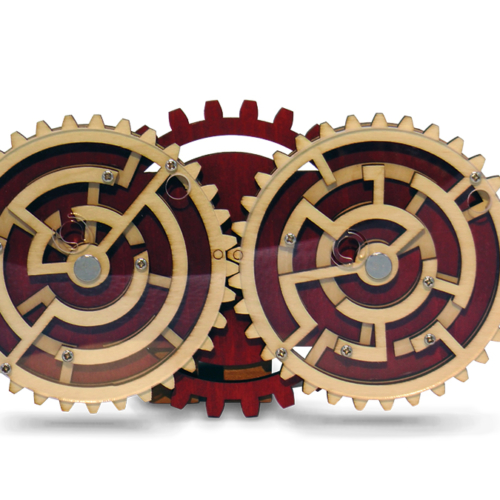 Can you find the way to remove both balls from the mazes simultaneously, though? Careful! The gears move at the same time, so a step towards the exit on one side may be a step backwards on the other.