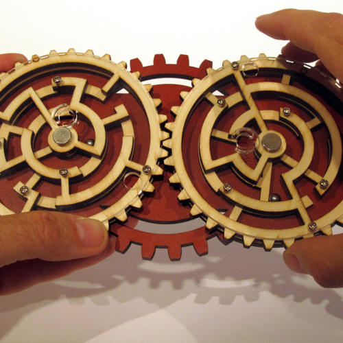 Two mazes, two balls, everything connected by giant gears. On their own, each maze is manageable.