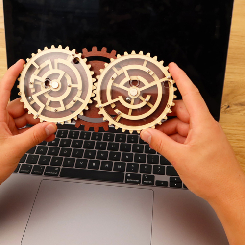 Can you find the way to remove both balls from the mazes simultaneously, though? Careful! The gears move at the same time, so a step towards the exit on one side may be a step backwards on the other.