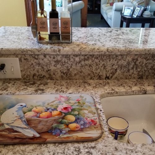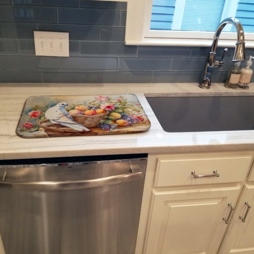Dish Drying Mat featuring breed specific Dove artwork. Say goodbye to messy countertops and soggy dish towels with our innovative dish drying mat. Our high-quality dish drying pad is designed to keep your countertops dry while offering a stylish and efficient solution. Whether you’re air drying dishes, glasses, stemware, silverware, pots, pans, bottles, or even fruits and vegetables, our dish mat is the perfect choice. The 14 inches x 22 inches size fits most counters and dish drying racks, and the non-slip design ensures stability. Made with water-absorbent polyester and a polyurethane foam insert, our dish drying mat is not only functional but also durable. It’s machine washable and printed in the USA for long-lasting use. The beautiful artwork adds flair to your kitchen decor, making it a perfect housewarming gift or present for any occasion. Upgrade your kitchen experience with our absorbent and versatile dish drying mat.
