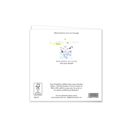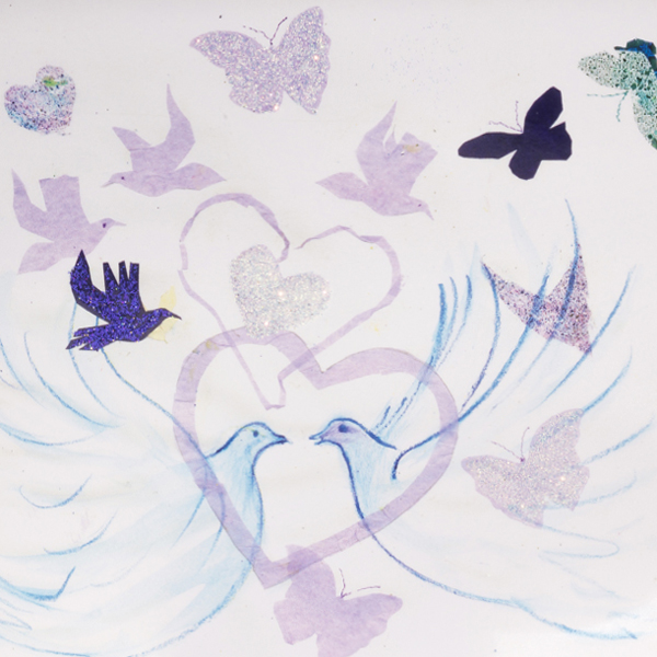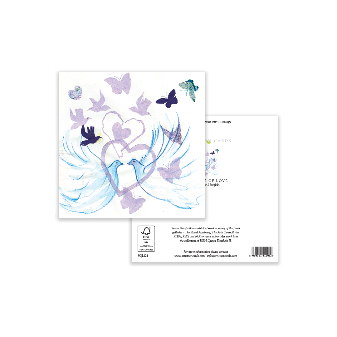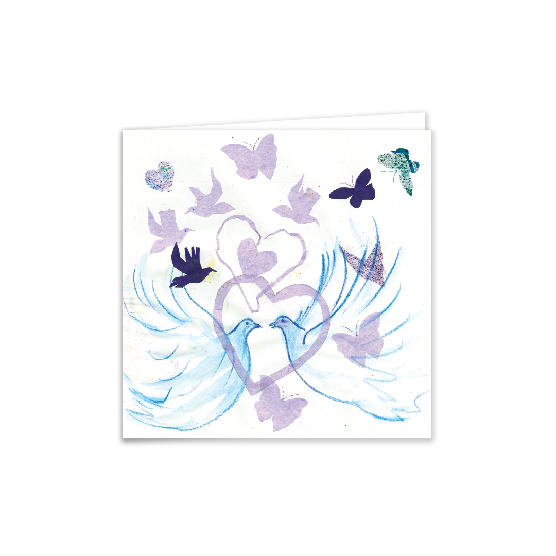 A romantic card featuring two doves framed by butterflies, birds and heart motifs. Created using pastel, watercolour, and tissue paper collage for a soft and expressive finish. Ideal for weddings, anniversaries, and love-themed occasions.