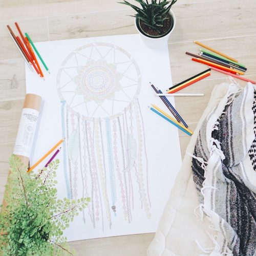 This large coloring page will make a perfect boho styled wall art, that can be personalized and filled in with your favorite colors! The illustration features a beautiful crocheted dreamcatcher with lace and beaded hangings.