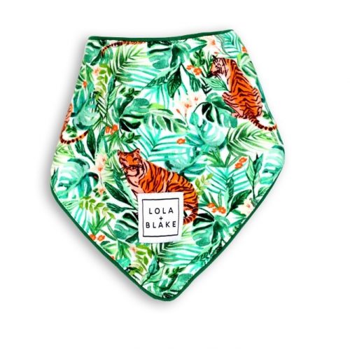 Cosy up and let little love’s imagination’s run wild with the tigers + luscious green foliage of this signature print. Our Jungle dribble bib matches perfectly with our Jungle Babygrow for a coordinated look. The soft emerald green towelling is a complementary backing + Velcro makes for an easy fastening.