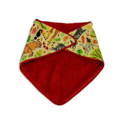 Our Safari dribble bib matches perfectly with our Safari Babygrow for a coordinated look. The soft earthy red towelling is a complementary backing and Velcro makes for an easy fastening.