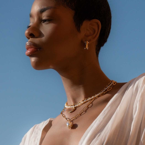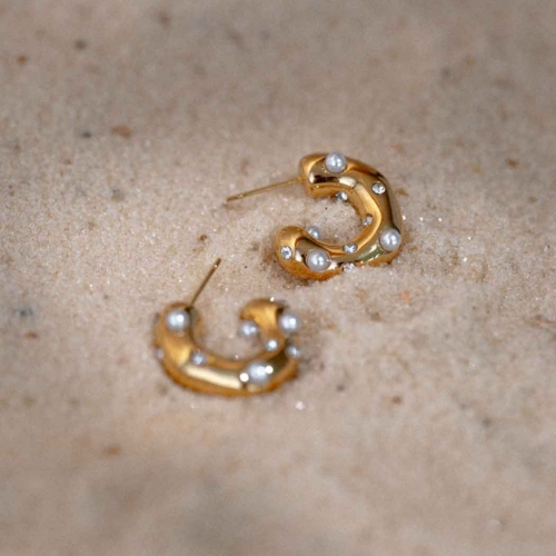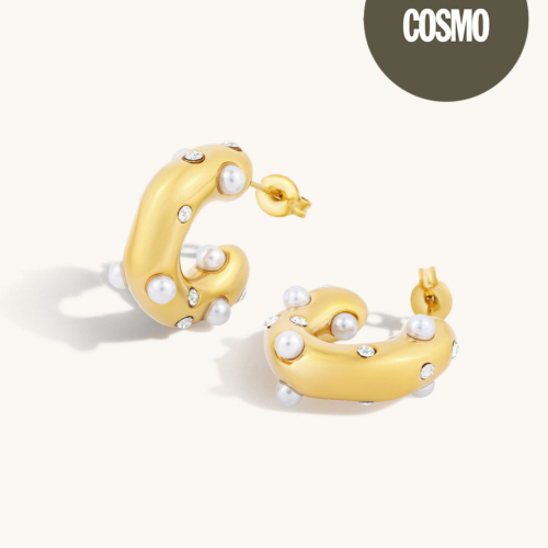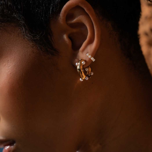 The ultimate head turner is here. An organically shaped statement hoop studded with mini cubic zirconia and pearl studs, essential for catching the light at any occasion. Alternatively, embody a more beachy vibe and wear with your best bikini when you’re soaking up the sun. MATERIALS : 18k gold plated recycled brass and sterling silver ear post, pearl, cubic zirconia SIZING : 25mm hoop