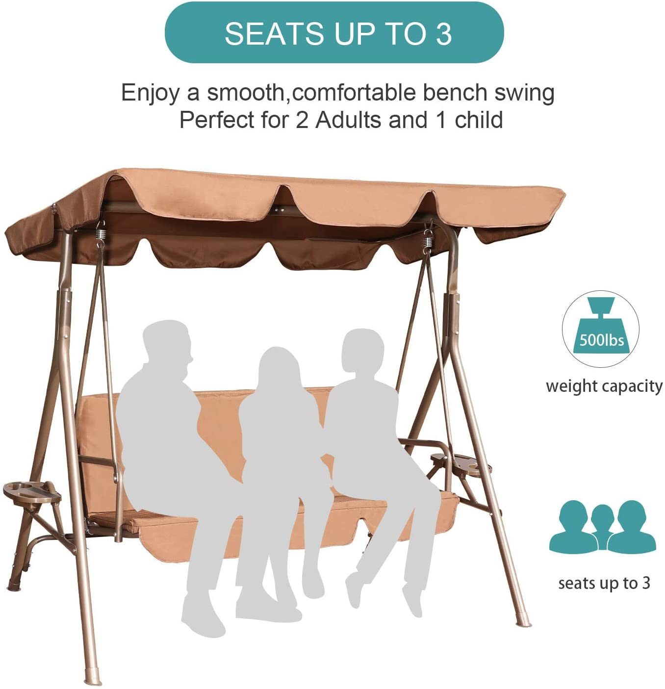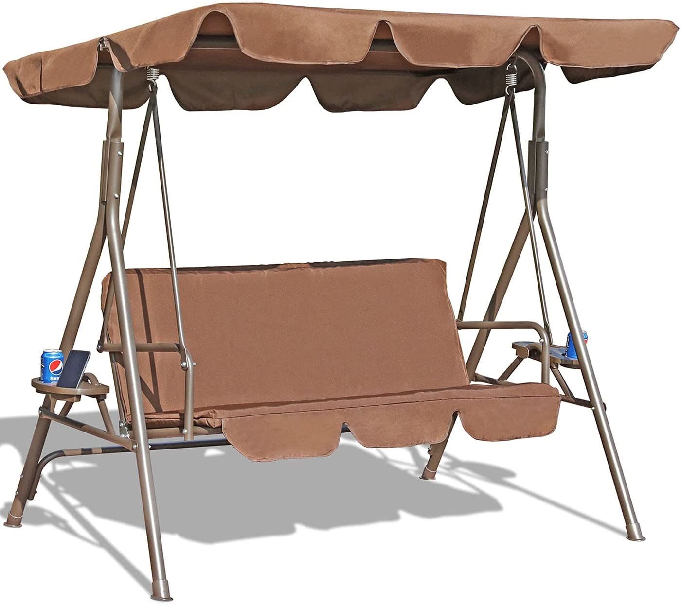 Highlights Strong & Durable: Durable Metal frame supports up to 500 lbs. The Stable triangular base is designed with unique Style Heavy Springs connect the chair to the frame, ensuring a smooth, gentle rocking motion. Perfect for porch, patio, garden, balcony and poolside Weather resistant & Adjustable: The adjustable canopy can be set at Various angles to provide optimal shade and protection from the sun’s harmful UV rays against the rain and dust,Weather-resistant Steel Frame Ensures Long lasting enjoyment for years to come. Comfortable and Novel Design: Upgraded with 2 Cup Tray, Suitable for holding your Phones and drinks and during your leisure time. Easy Upkeep: Removable polyester cushions are easy to wash while powder-coated steel wipes clean with a dry cloth to prevent scale; Overall Dimension: 67.5″(W) x 44″(D) x 60″(H); Easy to Assemble : Follow the instructions for simple assembly with included stools and hardware. Assembly time with 2 adults is approximately 50 mins. Details Durable Metal frame supports up to 500 lbs. The Stable triangular base is designed with unique Style Heavy Springs connect the chair to the frame, ensuring a smooth, gentle rocking motion. Perfect for porch, patio, garden, balcony and poolsideThe adjustable canopy can be set at Various angles to provide optimal shade and protection from the sun’s harmful UV rays against the rain and dust,Upgraded with 2 Utility Tray, Suitable for holding drinks and food during your leisure timeEasy to assemble and clean.Overall Dimension:67.5″(W)x 44″(D) x 59″(H)