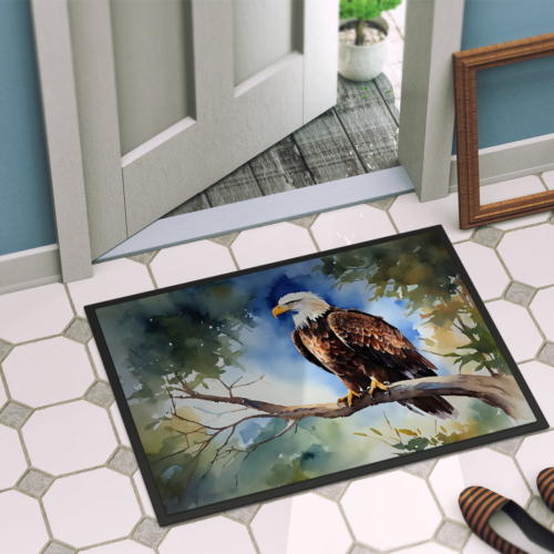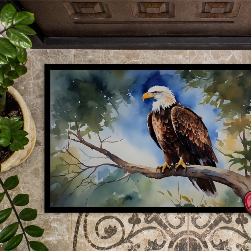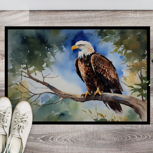 Doormat featuring breed specific Eagle artwork. Welcome your guests in style with our Artwork Door Mat, designed to withstand almost any weather condition. This mat, measuring approximately 18 by 27 inches, is held together by durable black binding tape. Its top layer, composed of polyester felt, is dyed with the eye-catching image you see on the mat. A few layers below provide the mat with stability, while its rubber bottom is stamped to help prevent slipping and ensures safety. Our mat works wonderfully as both an indoor or outdoor door mat. For cleaning, simply hose it off with water or use a power washer – no need for any cleaner that produces suds. Avoid scrubbing with a brush, instead, opt for the vacuum on floor setting. Designed manufactured and printed in the USA, this mat is a perfect addition to your porch, outdoor kitchen, entryway, or any indoor space. Its unique design makes it a charming decorative rug that greets your guests and adds a stylish touch to your home decor.