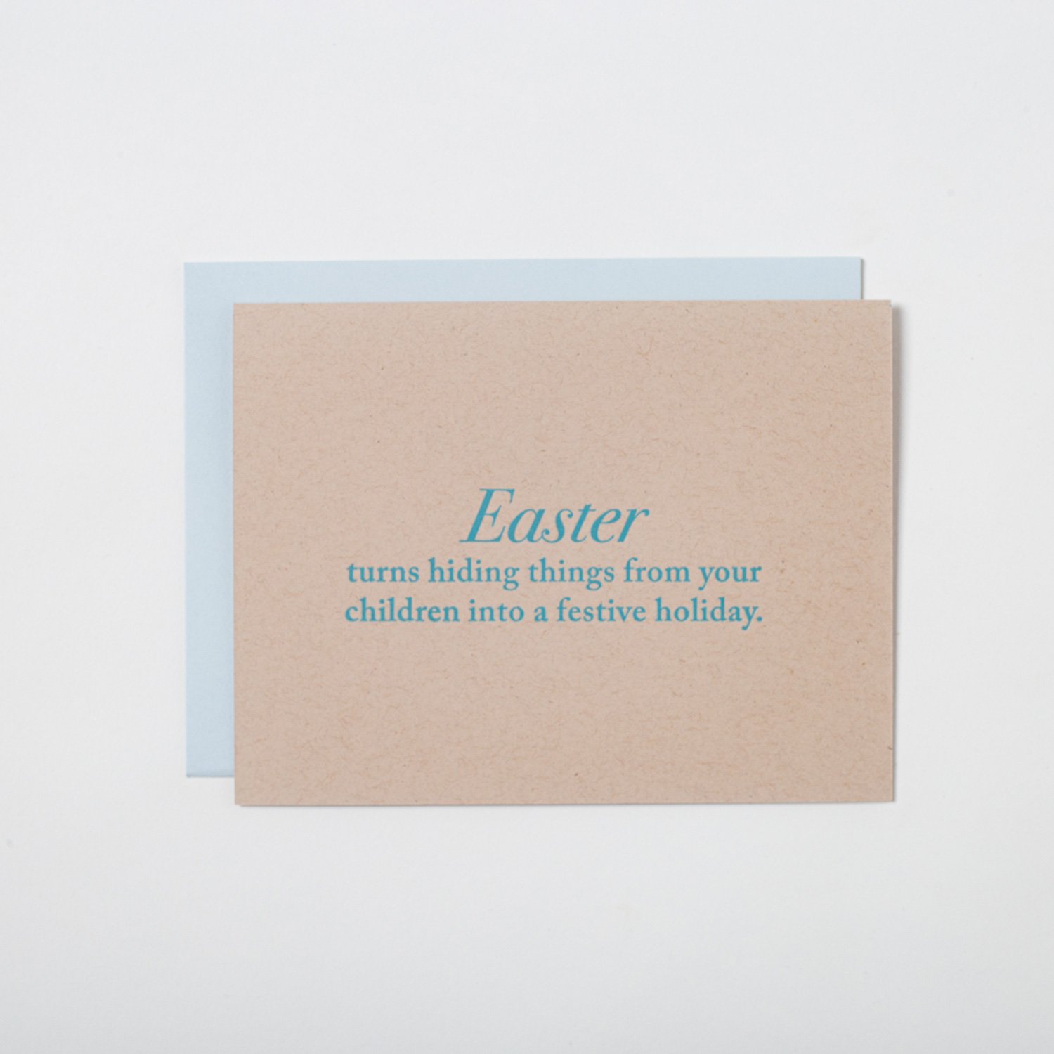 A funny, handmade Easter card featuring pretty lettering and a blank interior for personalized messages. Our 100% eco-friendly cards are letterpress printed with polymer plates on recycled paper and packaged in a biodegradable clear sleeve.