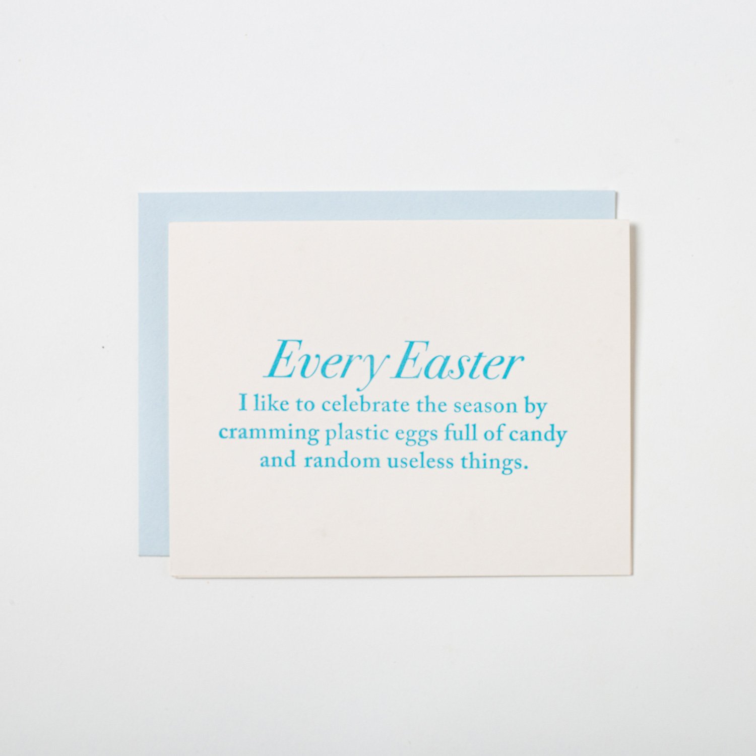 A funny, handmade Easter card featuring pretty lettering and a blank interior for personalized messages. Our 100% eco-friendly cards are letterpress printed with polymer plates on recycled paper and packaged in a biodegradable clear sleeve.