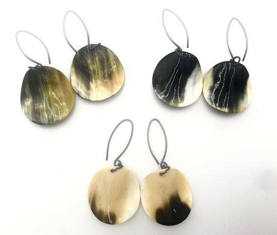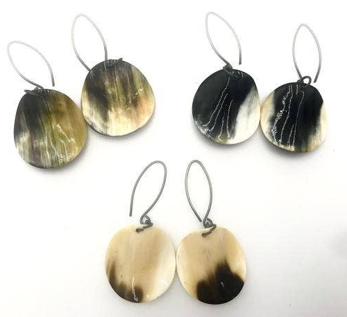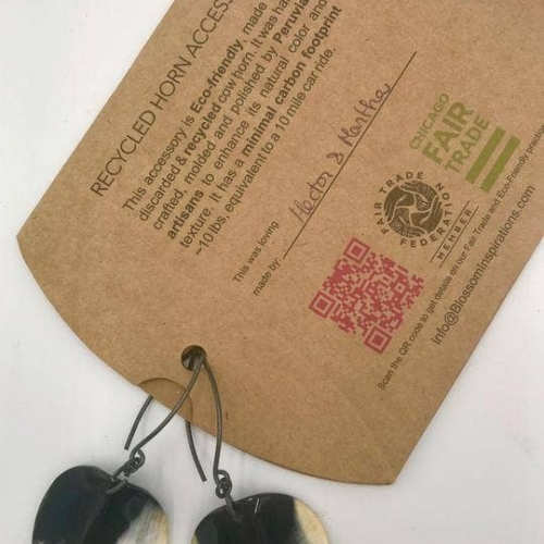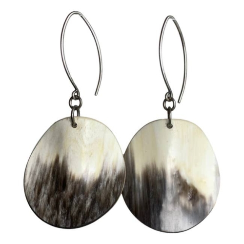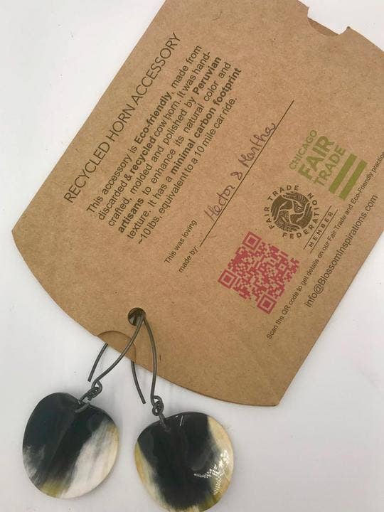 Eclipse – Artisanal horn earrings with Peruvian silver 925. This handmade jewelry is made from natural discarded and recycled cow horn with Peruvian sterling silver 925 crafted by Peruvian artisans. Each unique piece has been hand cut, molded and polished to bring out the natural horn color and texture in a brilliant finish. The metal back is sterling silver in black to get a rustic style. Diameter – 1.25″.