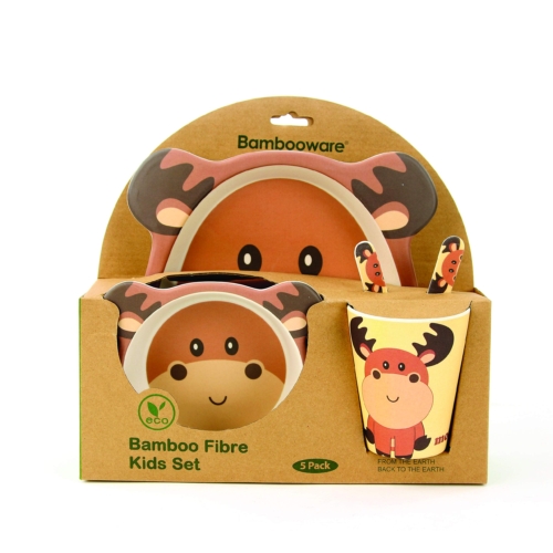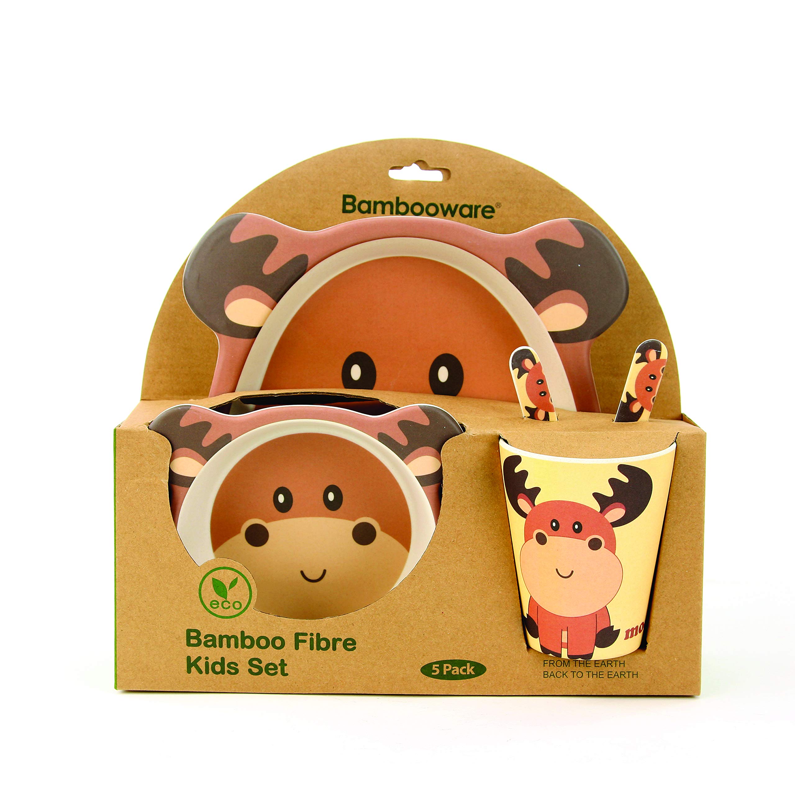 High quality eco bamboo kids dinnerware set in a cute, fun, and kid-friendly moose design.