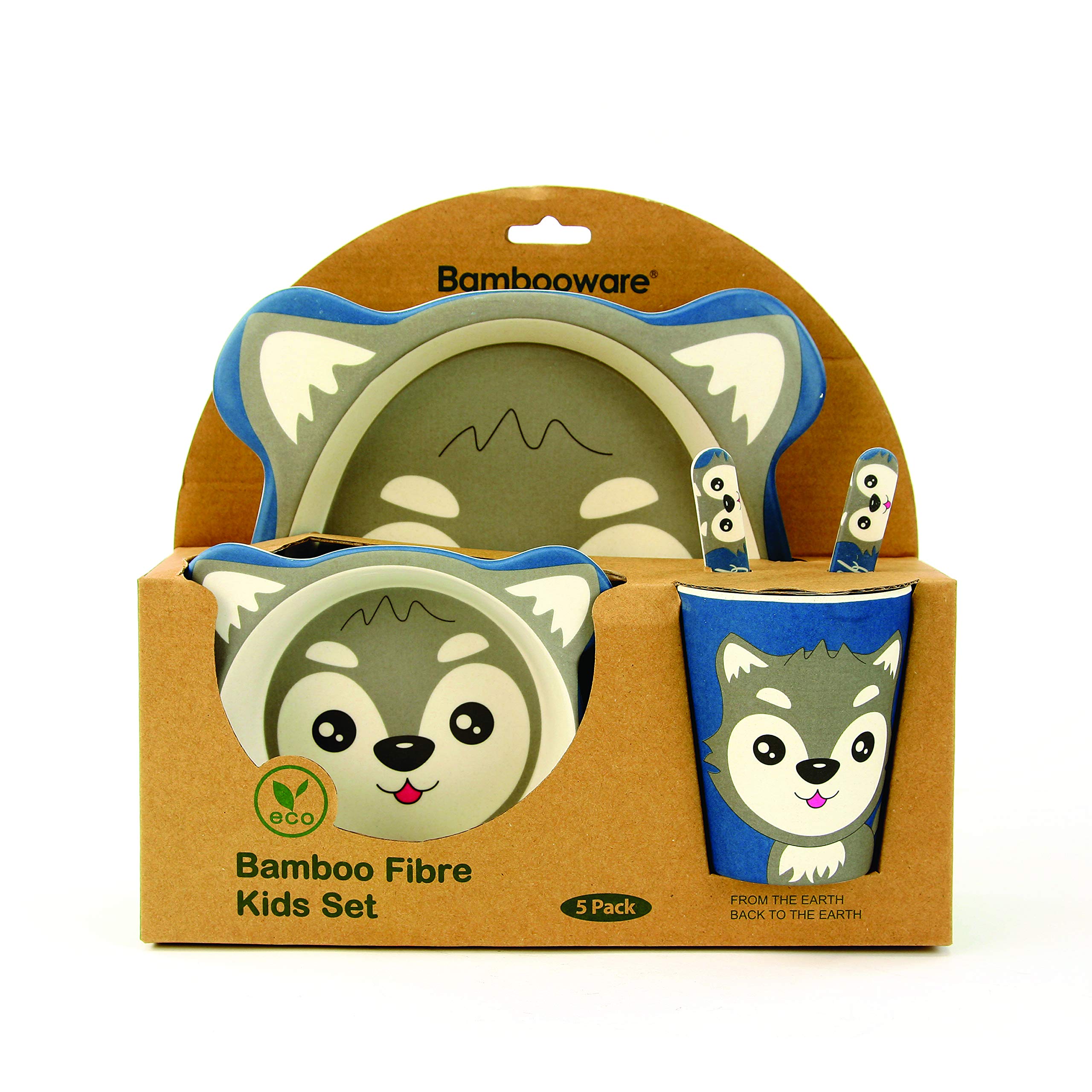 High quality eco bamboo kids dinnerware set in a cute, fun, and kid-friendly wolf design.