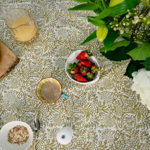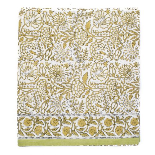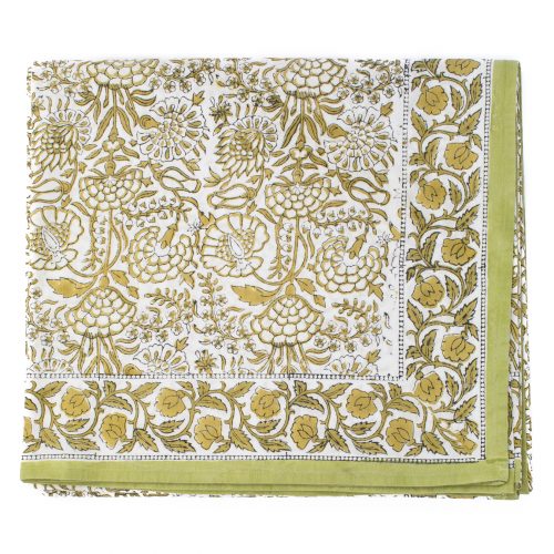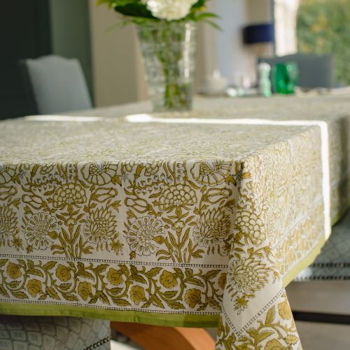 Celebrate a lush bloom indoors with our exquisite Eden tablecloth in fresh lime adorned by a classic floral blockprint pattern to spruce your table decor. Fits a sitting of 10 – 12 persons. Crafted by artisans in India.