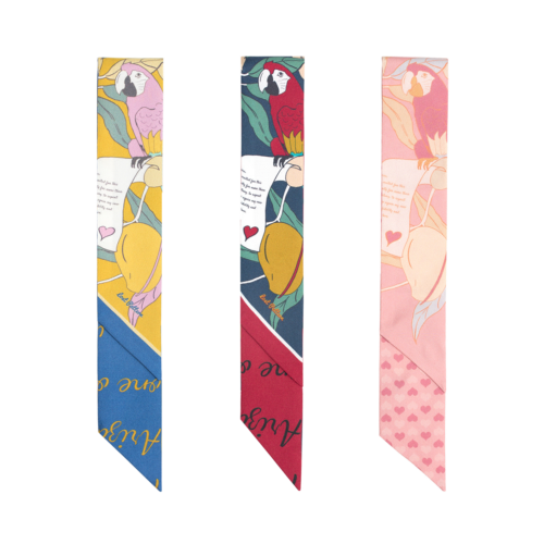 Tropical Love, dancing in the forest with the distant songs of birds and rain in the distance while the sun is still shining down. The feel of this pattern is that of a love story in the humidity and warmth of the tropics. Bright colors, vibrant colored floral accents, just waiting for you to take this story with you on whatever journey is next. Product Description: 1100% mulberry silk 120cm x 5cm ( 2″W x 47″L ) Double-sided stitching 3 color options: Pink, Tropical Red & Green and & Yellow & Blue Different patterns on each side Styling: As a necktie: worn as a bow around your neck or tied like a classic necktie. As an accessory to a top: wear under a collared shirt. As a vest: loosely worn over the shoulders, framing a top or jacket. As a hair accessory: wear as a headband, over a low ponytail, or woven into a braid. As a bag accessory: tie around your purse for a pop of color. As a body accessory: wear around your wrist like a bracelet. Style it any way you want in your own mood and creativity!