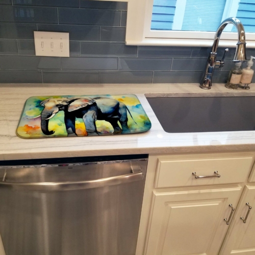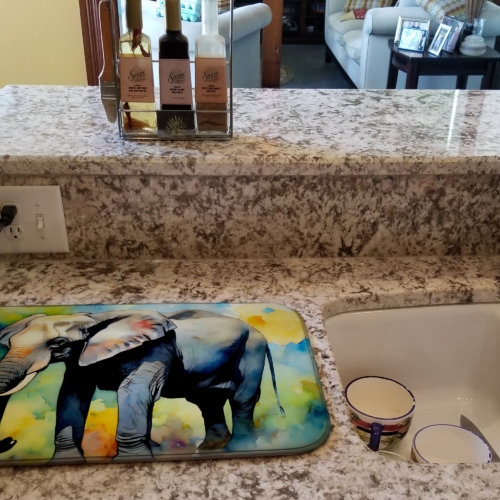 Dish Drying Mat featuring breed specific Elephant artwork. Say goodbye to messy countertops and soggy dish towels with our innovative dish drying mat. Our high-quality dish drying pad is designed to keep your countertops dry while offering a stylish and efficient solution. Whether you’re air drying dishes, glasses, stemware, silverware, pots, pans, bottles, or even fruits and vegetables, our dish mat is the perfect choice. The 14 inches x 22 inches size fits most counters and dish drying racks, and the non-slip design ensures stability. Made with water-absorbent polyester and a polyurethane foam insert, our dish drying mat is not only functional but also durable. It’s machine washable and printed in the USA for long-lasting use. The beautiful artwork adds flair to your kitchen decor, making it a perfect housewarming gift or present for any occasion. Upgrade your kitchen experience with our absorbent and versatile dish drying mat.