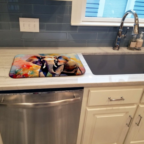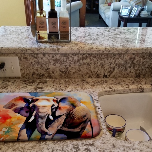 Dish Drying Mat featuring breed specific Elephant artwork. Say goodbye to messy countertops and soggy dish towels with our innovative dish drying mat. Our high-quality dish drying pad is designed to keep your countertops dry while offering a stylish and efficient solution. Whether you’re air drying dishes, glasses, stemware, silverware, pots, pans, bottles, or even fruits and vegetables, our dish mat is the perfect choice. The 14 inches x 22 inches size fits most counters and dish drying racks, and the non-slip design ensures stability. Made with water-absorbent polyester and a polyurethane foam insert, our dish drying mat is not only functional but also durable. It’s machine washable and printed in the USA for long-lasting use. The beautiful artwork adds flair to your kitchen decor, making it a perfect housewarming gift or present for any occasion. Upgrade your kitchen experience with our absorbent and versatile dish drying mat.