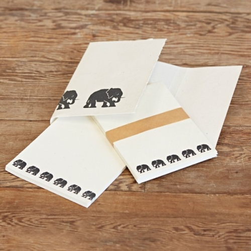 Quirky and practical, our elephant dung stationery sets make a great gift to stay in touch with the elephant lover in your life. Each set includes 20 sheets of A5 handmade elephant dung paper and 10 envelopes, each decorated with a charming border of elephants._x000D__x000D_Dimensions: 21 × 15 cm (Paper is A5)_x000D__x000D_Our elephant dung stationery is hand crafted from 25% recycled paper and 75% elephant dung, meaning there can be some variation in the texture and shade of the paper depending on their diet. Each sheet of paper is truly as unique as the elephant that helped to create it! The paper is acid-free, suitable for all pens, and coloured with only natural dyes._x000D__x000D_Due to the handmade nature of these products each one is unique, but loveliness comes as standard._x000D__x000D_The products in our elephant dung range are made by skilled and creative artisans using elephant dung paper from the Maximus Elephant Conservation Trust._x000D__x000D_The ultimate in recycling, elephant dung is collected and boiled to sterilise it before the paper-making process. As unique as the animal that helped to produce it, each piece of paper is different depending on the diet of the elephant._x000D__x000D_Improving the outlook for the majestic elephants of Sri Lanka, Maximus has its workshop in the grounds of the Millennium Elephant Foundation (MEF), a wonderful small charity that cares for sick, old, and disabled elephants. Working with initiatives like Maximus, the foundation is able to show the positive relationship local economies can have with these amazing animals, and work towards resolving the conflict between the elephants and the local communities as they turn to eating farmers’ crops as their natural habitat is destroyed._x000D__x000D_By making a purchase, you are helping to continue the fantastic work of our producers._x000D_