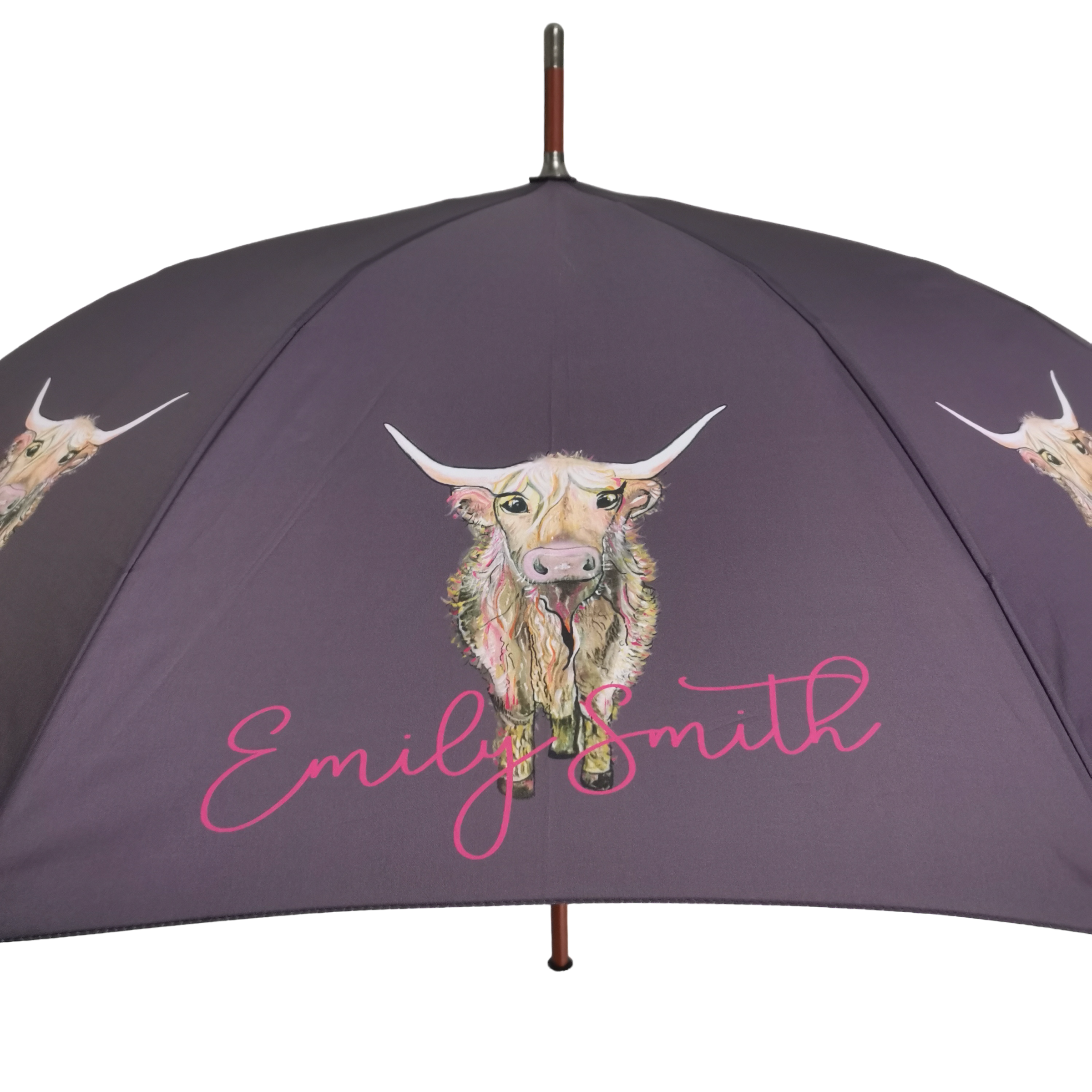 This Heidi Highland Cow Umbrella designed by Emily Smith Designs and produced by Soake is made with a wooden shaft and handle, fibreglass frame and ribs and a superior pongee material for the canopy.Purchase SOAKE umbrellas with total and absolute confidence. We are established, experienced and passionate about our business, our umbrellas and most importantly you, OUR CUSTOMERS. SOAKE are UK designers, importers and distributors of great quality, beautifully designed umbrellas which all carry our famous no quibble 1 year warranty against faulty workmanship. Soake have been providing umbrellas to customers in the UK for many years and are a UK owned business offering a “local” service that many overseas suppliers simply cannot match. You can buy in ABSOLUTE CONFIDENCE from an ESTABLISHED UK BUSINESS.